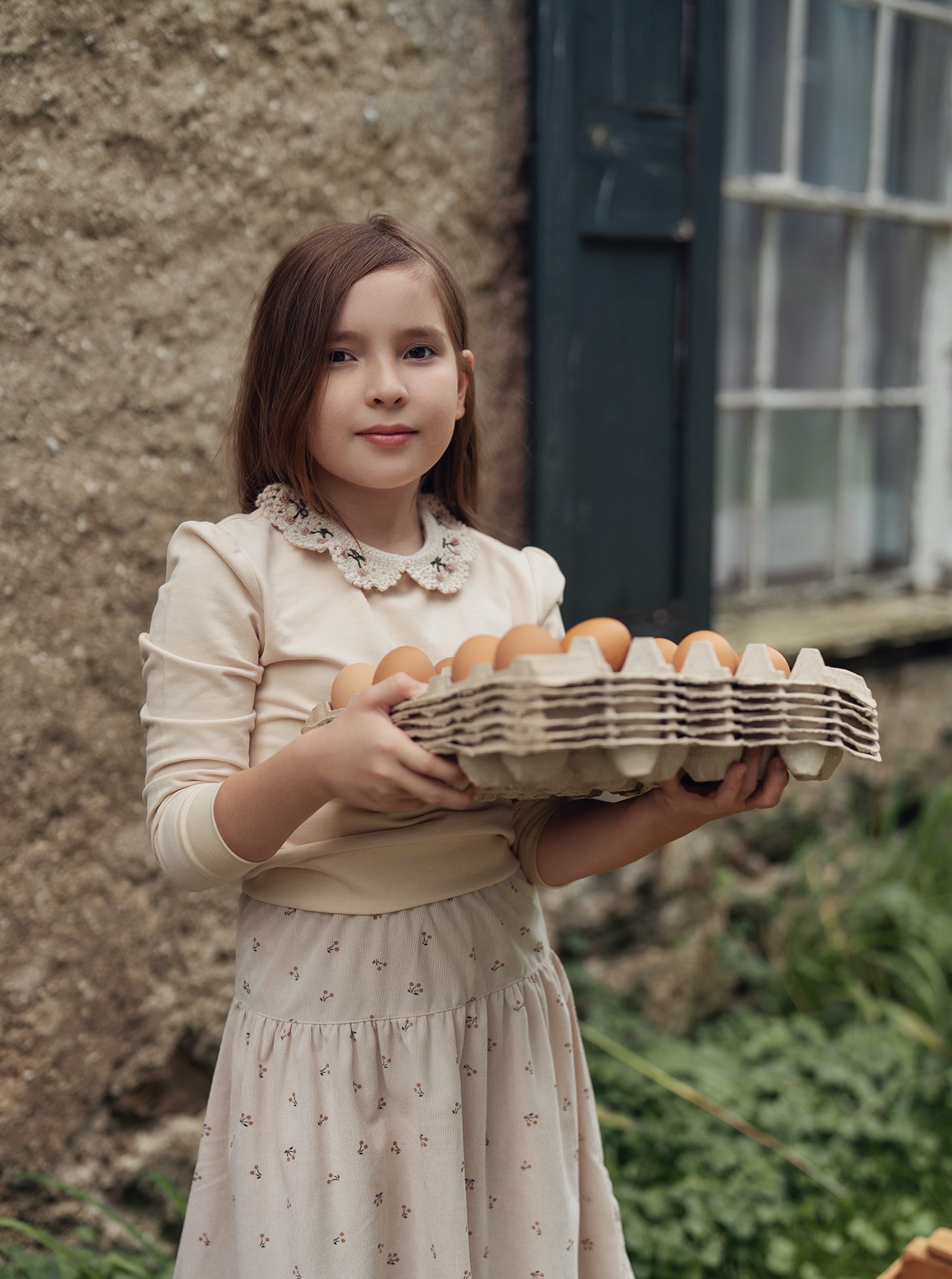 Girls french fleece sweater with crochet collar and center back button opening. Mathcing corduroy skirt with covered elastic waistband. ֲ