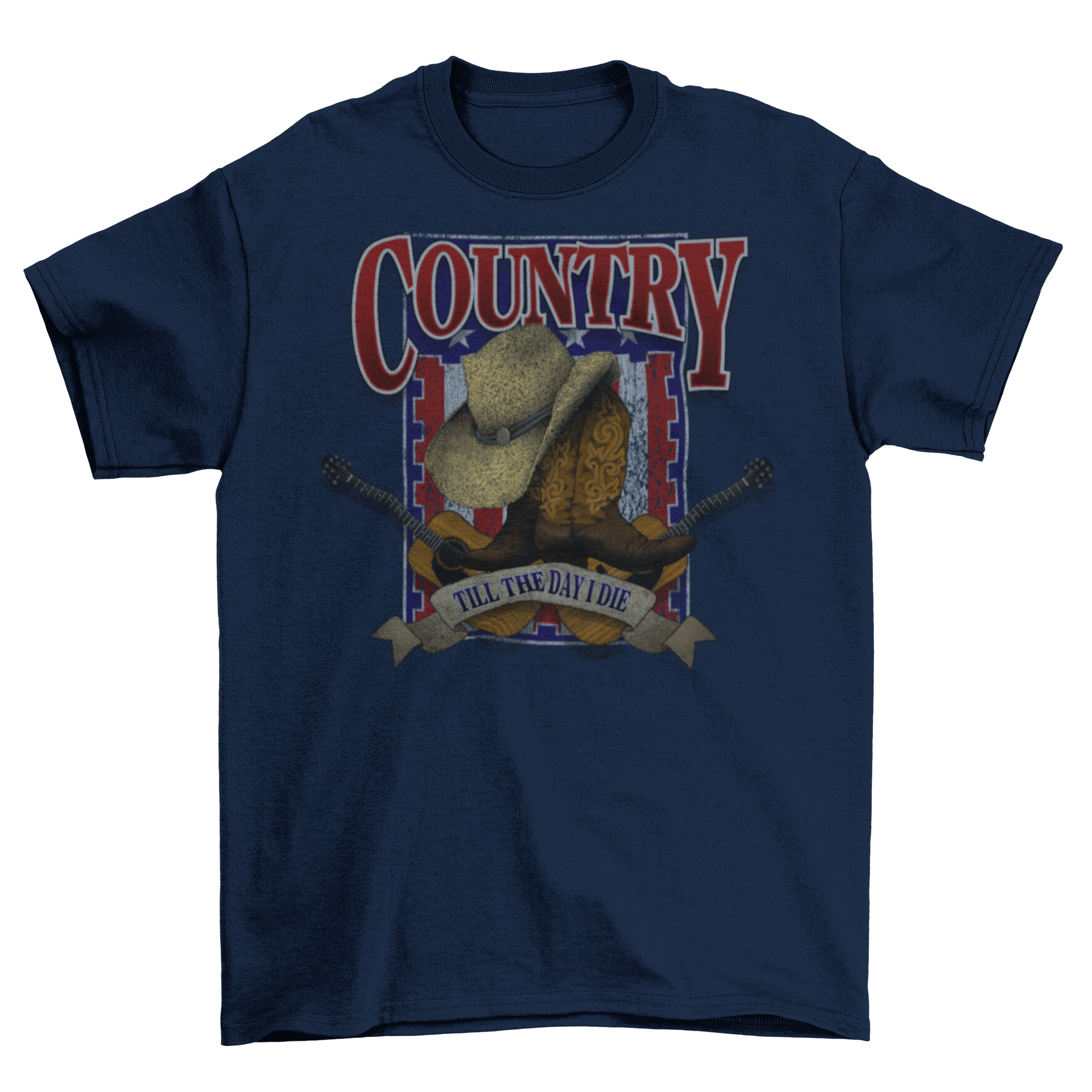 Emblazoned across the front of the shirt is the bold statement, "Country Till I Die." These powerful words encapsulate the depth of your commitment to country music, proclaiming your undying love and loyalty to the genre. The text is expertly integrated into the design, enhancing its impact and adding an extra layer of artistic flair.