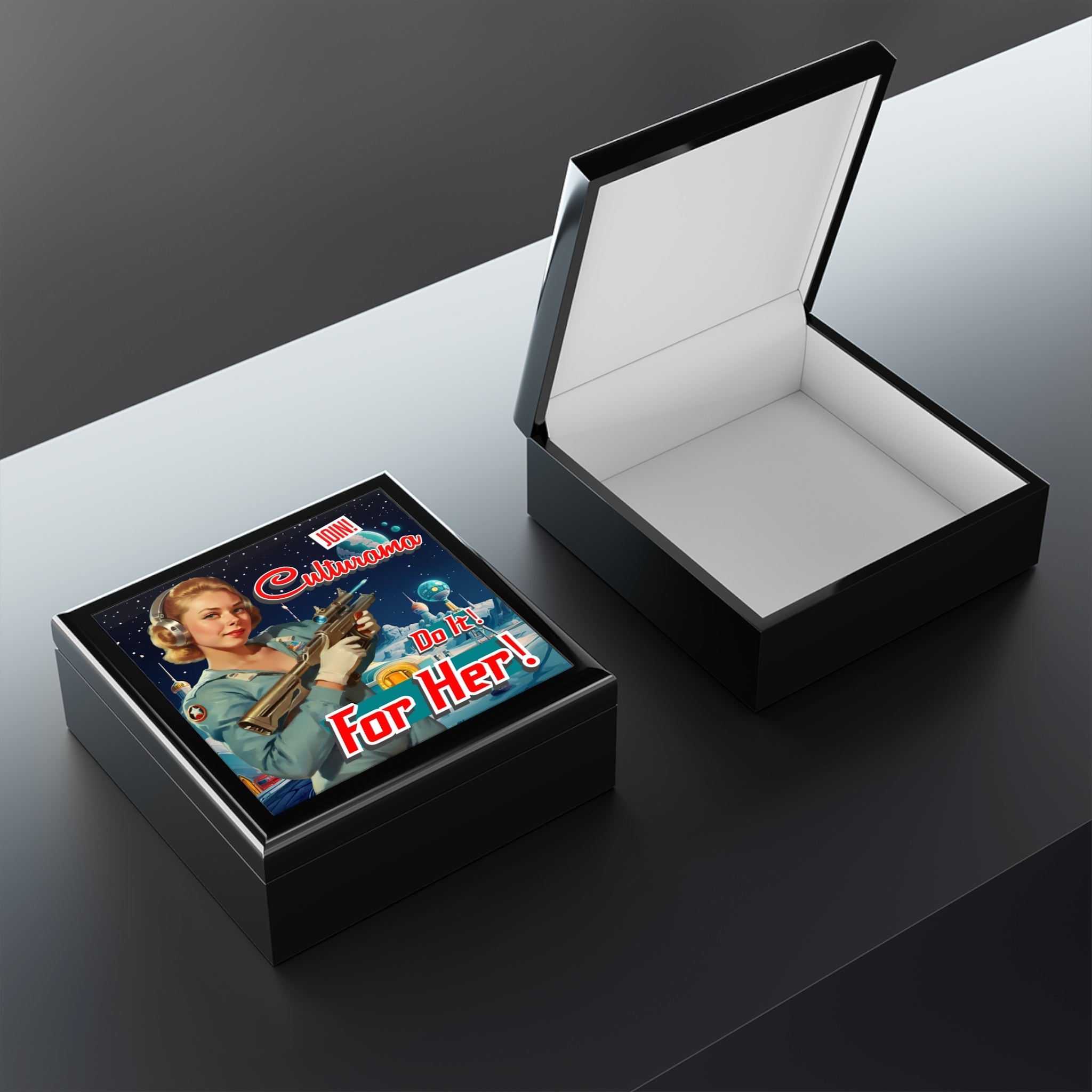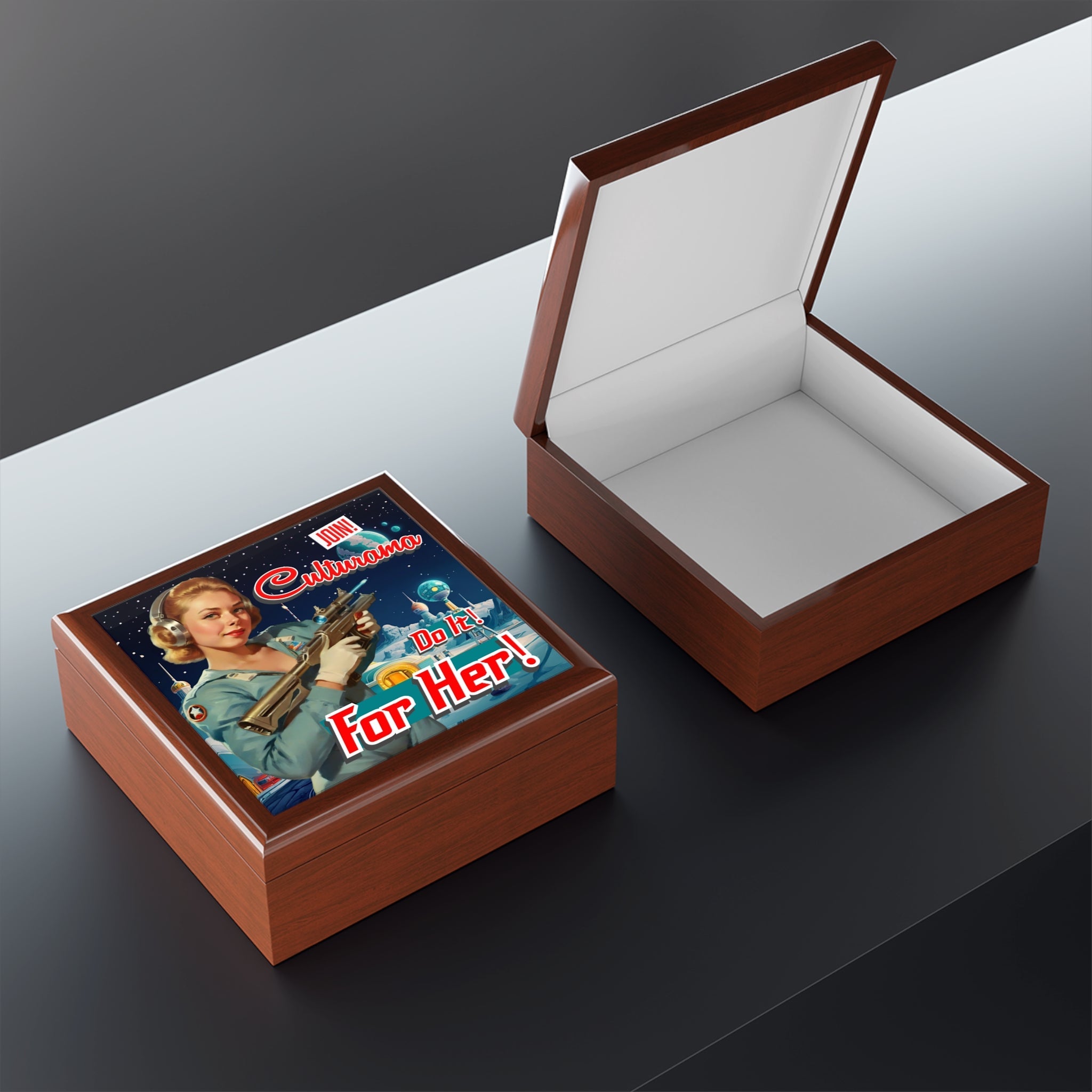 Keep your treasures guarded in intergalactic style with this one-of-a-kind Culturama jewelry box, featuring Daniella Pentsak as a retro-futuristic space girl! Inspired by vintage 1950s propaganda art, this jewelry box brings a dash of old-school heroism with its call to “JOIN! Culturama: Do it! For her!”—perfect for anyone drawn to bold missions and timeless style. The box’s high-quality rubberwood construction is finished with a sleek varnish, while its glossy ceramic tile lid captures the vibrant design in stunning detail.