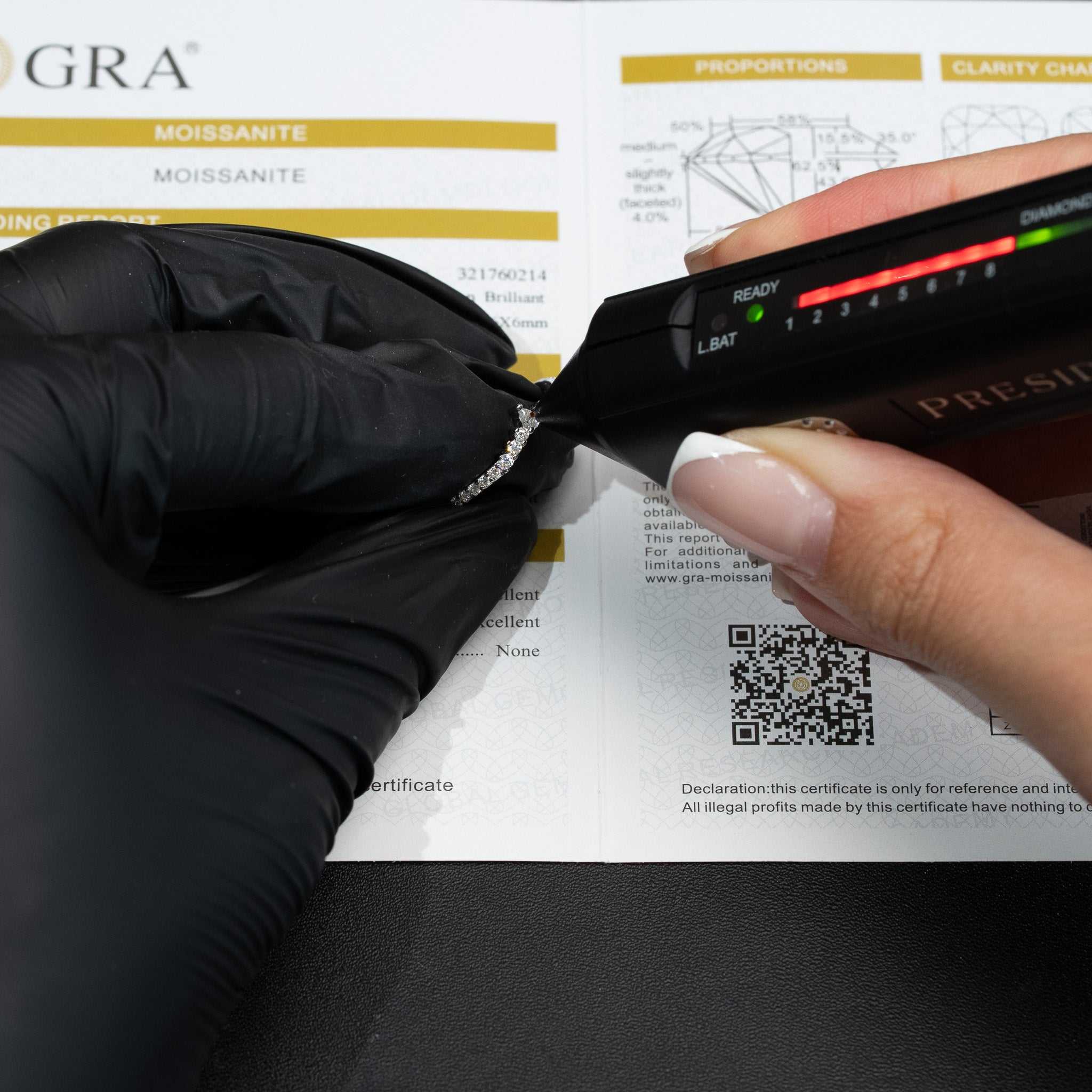Each ring comes with moissanite certificate report. Our moissanite passes the diamond tester.