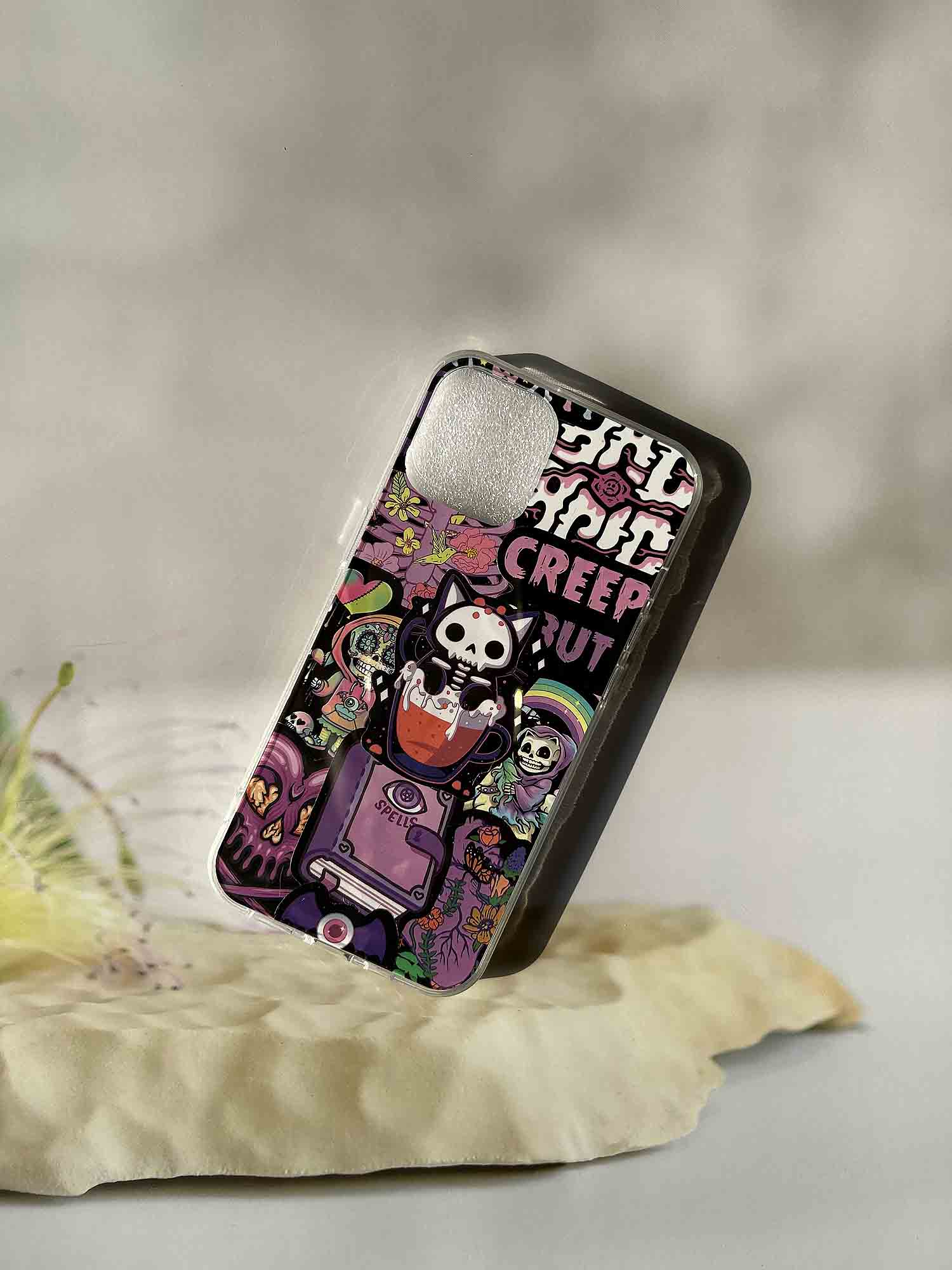 Cute Gothic Tea Cup Skull Cat DIY Phone Case Kit | ZAKAPOP ‐ Finished Product (1 Phone Case + 5 Finished Back Cards + 50 Pieces Of Stickers) / iPhone 12