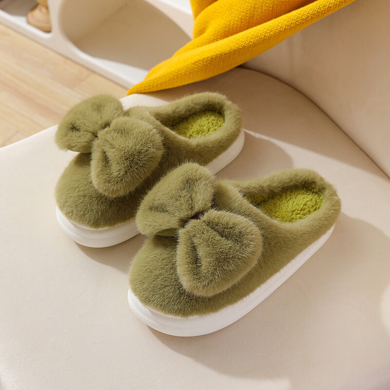 Cute Plush Winter Slippers With Bow | ZAKAPOP ‐ Olive Green / 7-8 Women