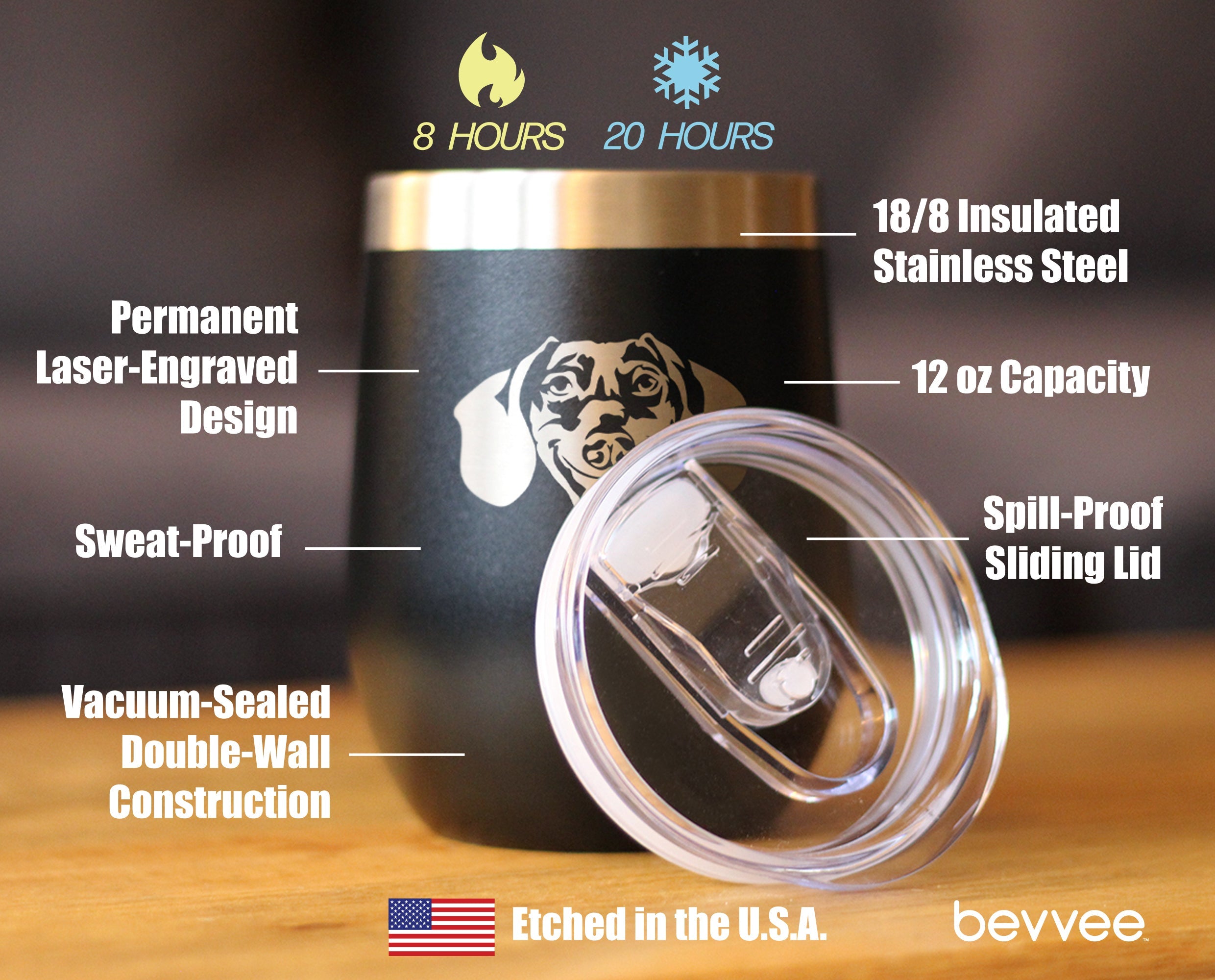 Our 12oz. stemless wine tumblers with sliding lids feature stainless steel double-wall construction, vacuum insulated for 2X cold and heat retention compared to glass or plastic containers! Etched in America.