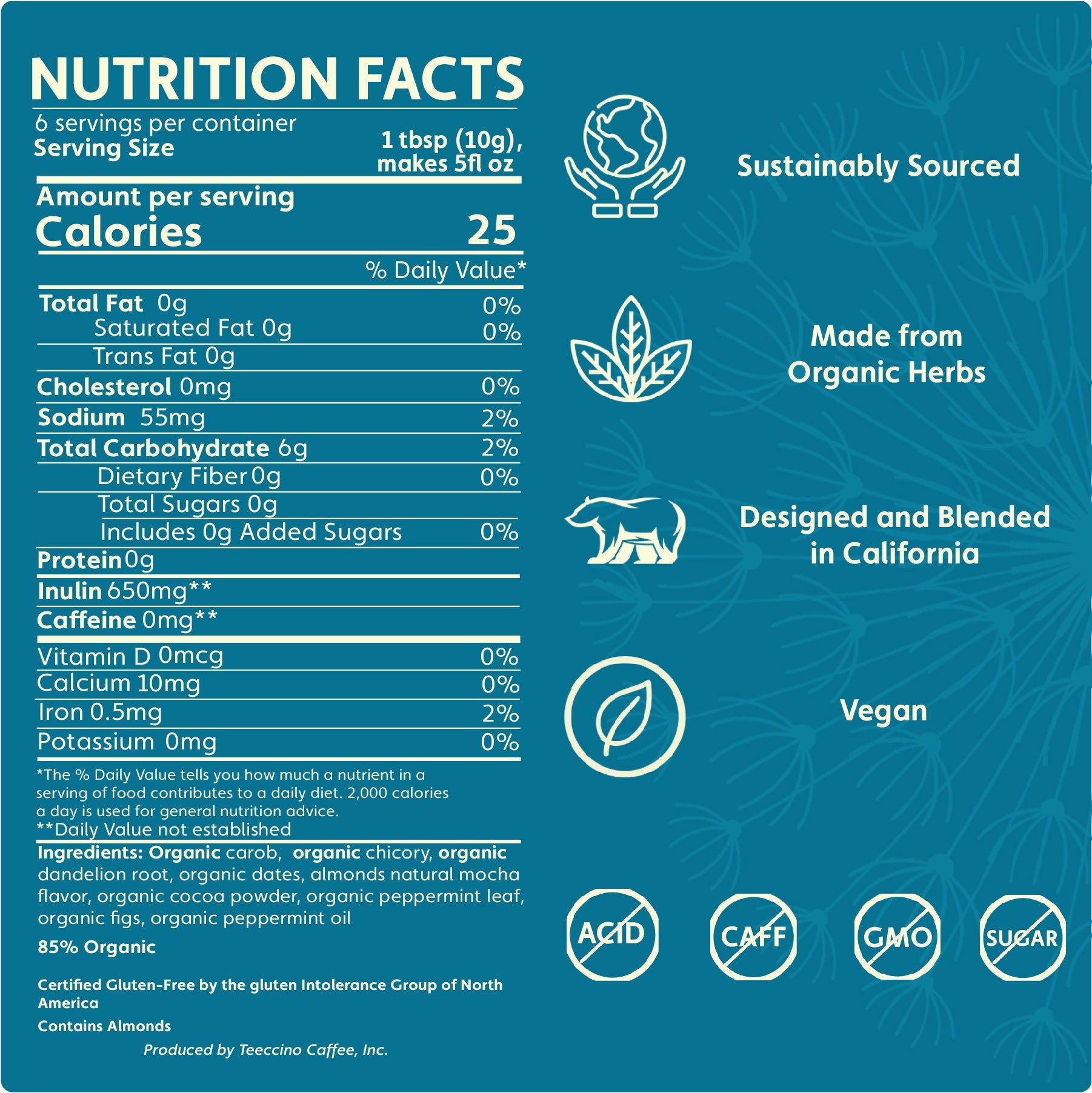 The coolness of peppermint leaves fuse with deep roasted dandelion and chicory roots; the lush richness of cocoa powder creates a chocolaty finish.