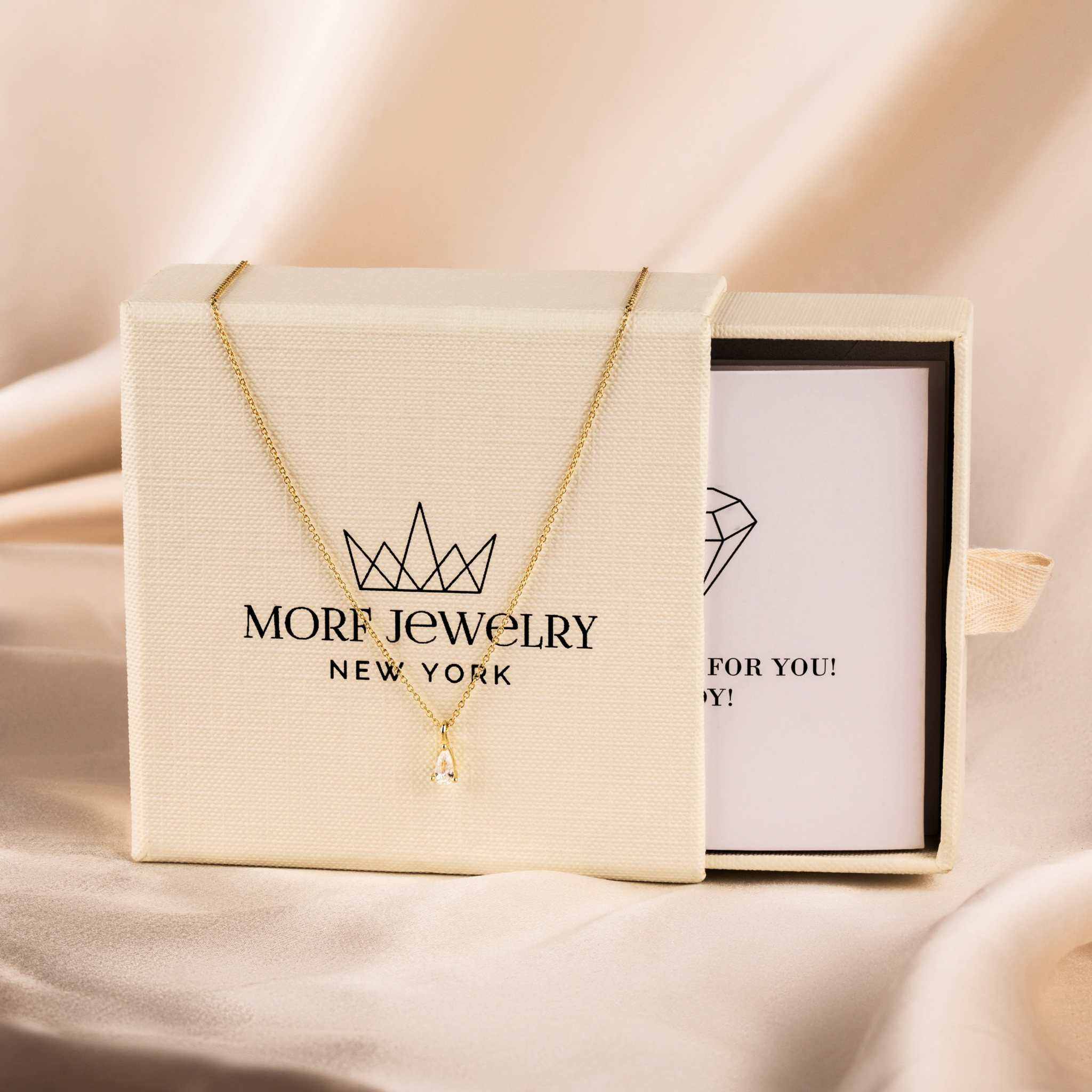 Teardrop Diamond Necklace by Morf Jewelry is a timeless piece that captures the essence of grace and sophistication. This exquisite necklace showcases a stunning pear-shaped diamond, delicately suspended from a dainty chain. Crafted with precision and attention to detail, it is a true testament to our commitment to creating exceptional jewelry.
