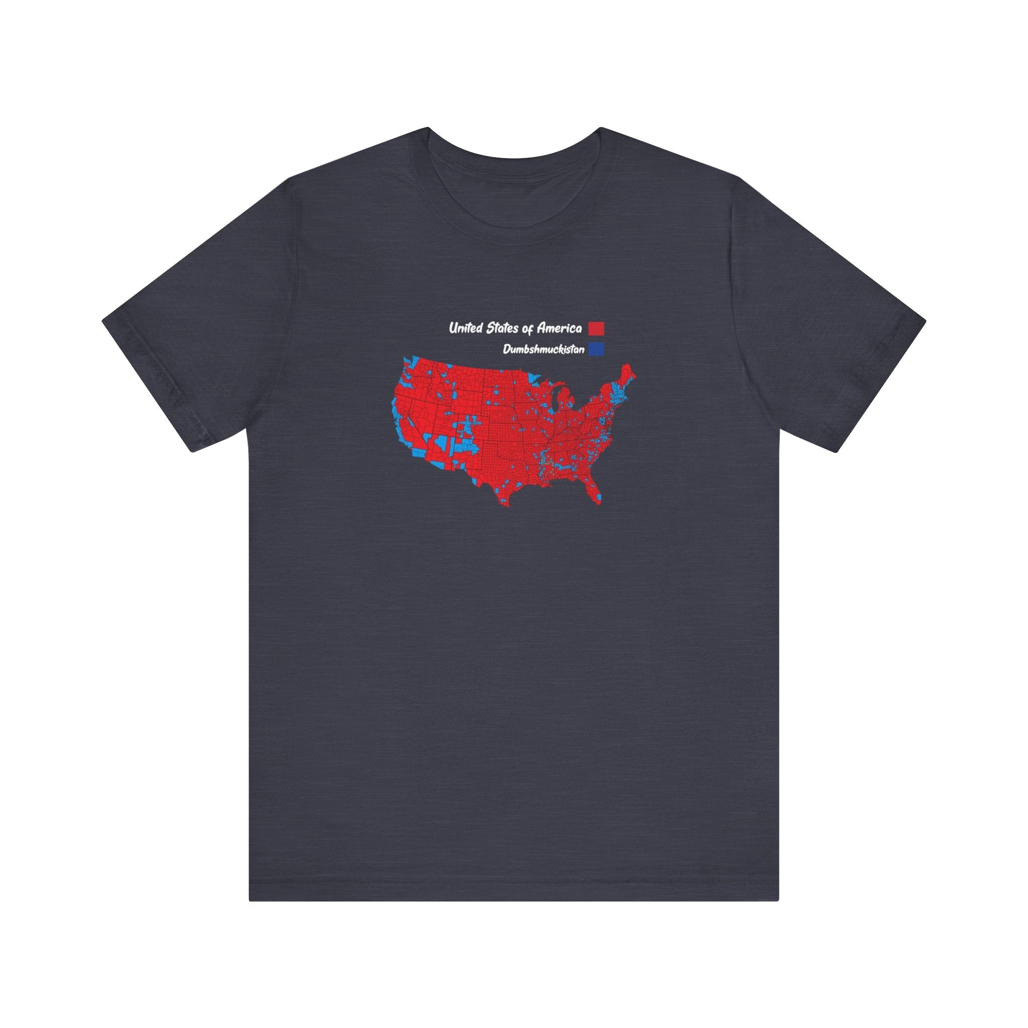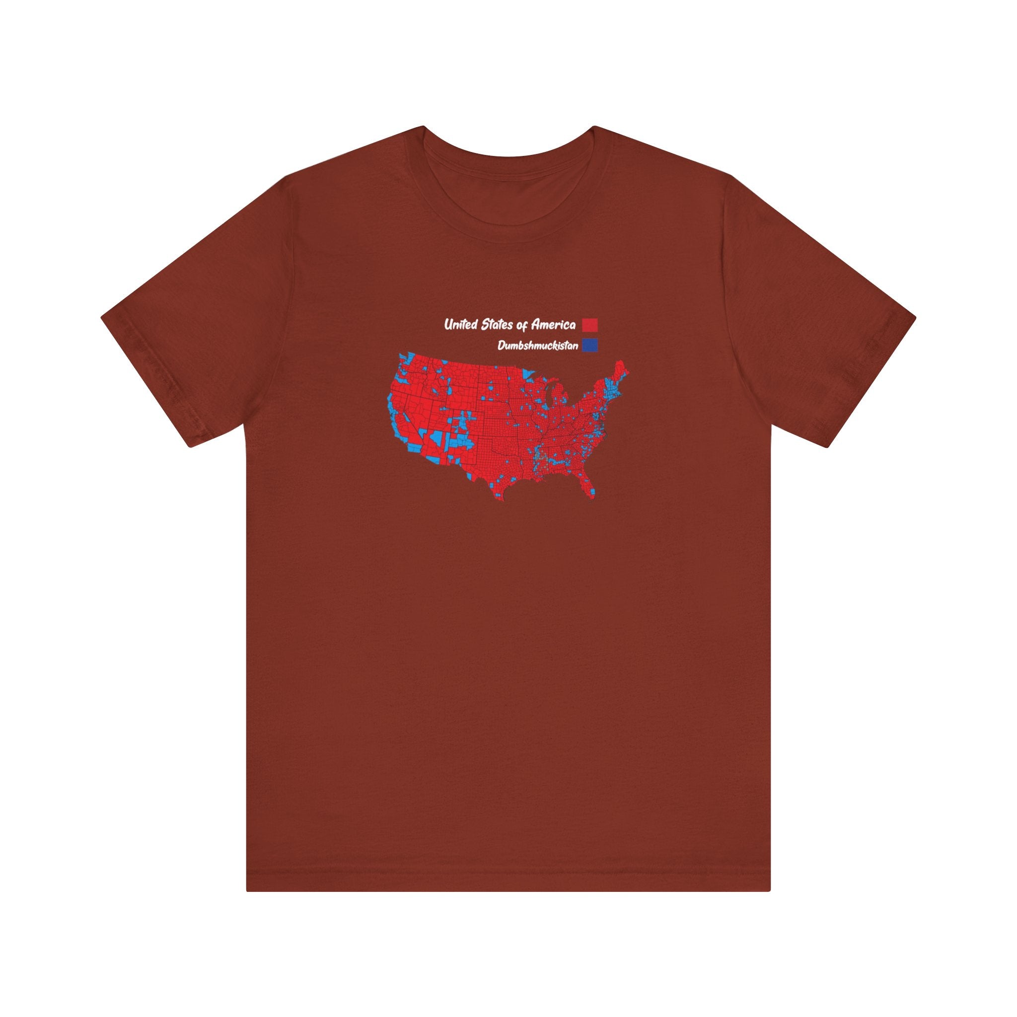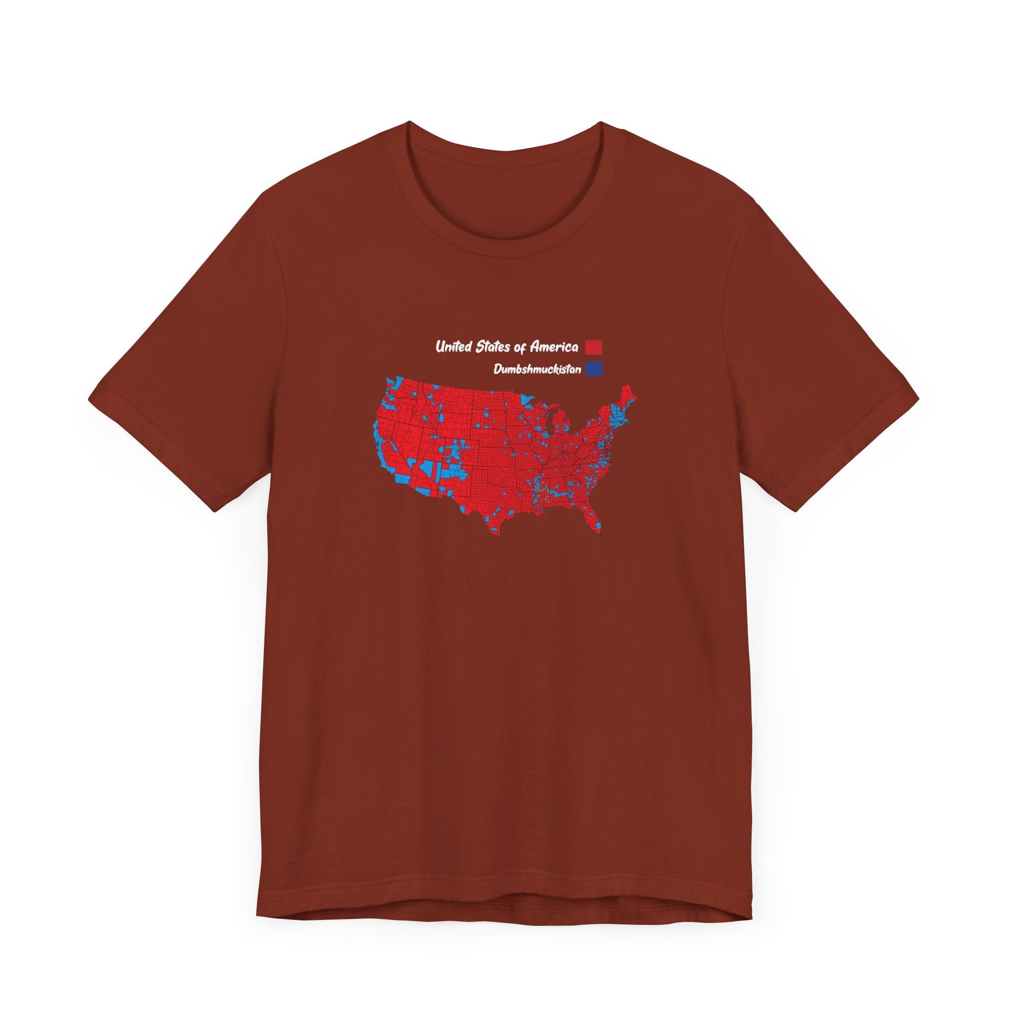 Introducing the Divided States T-Shirt – a bold, humorous take on today’s divided America! This comfortable tee features a satirical U.S. map split into two contrasting regions: red for the "United States of America" and blue for "Dumbschmuckistan." Designed for those who enjoy wearing their views with a touch of humor, this shirt is perfect for making a statement or sparking conversations wherever you go. Made from soft, high-quality cotton, it’s the ideal blend of comfort and wit. Wear it proud, and show the world what side you're on – with a laugh!