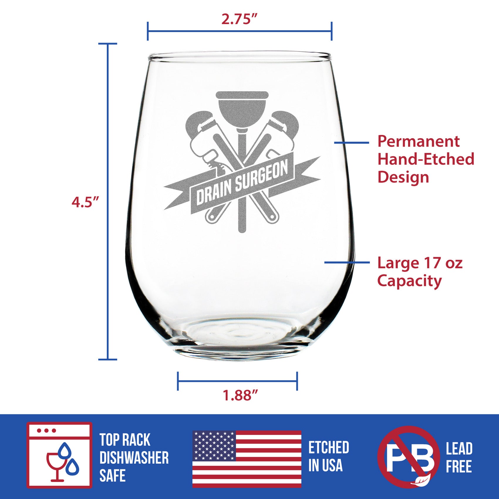 Drain Surgeon - Stemless Wine Glass - Funny Plumber Gifts for Men and Women - Large 17 Ounce Glasses