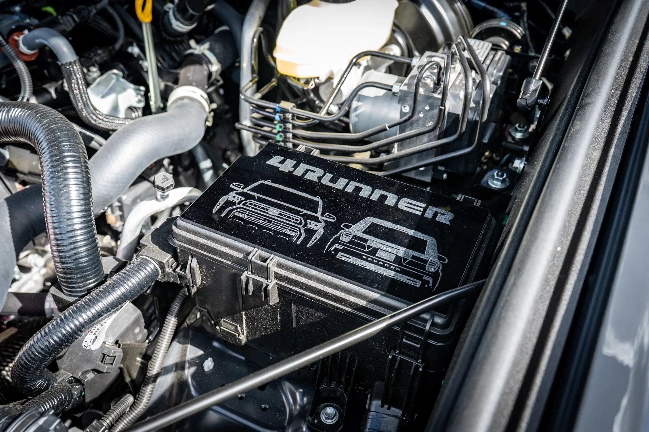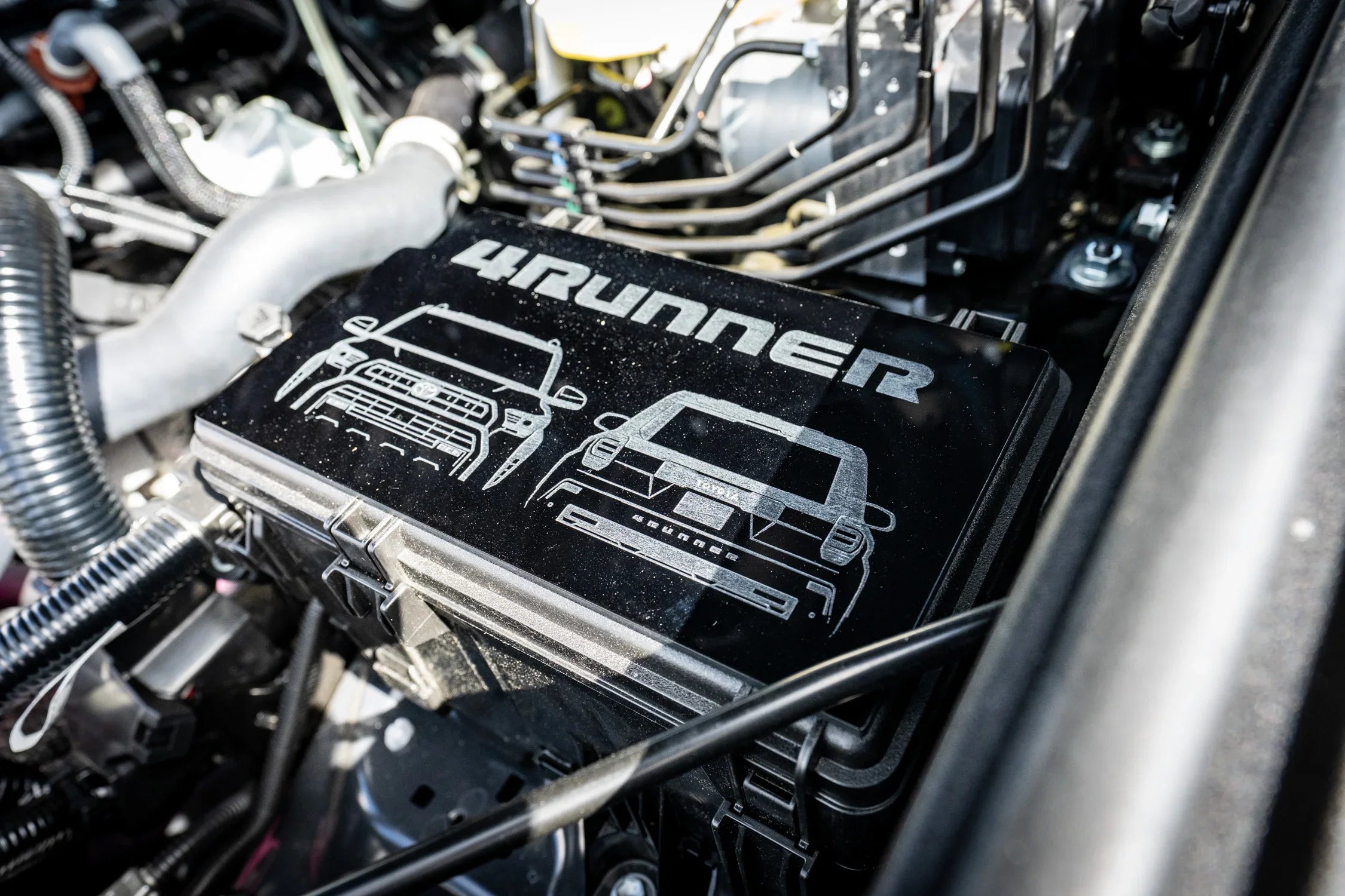 This neat under hood decor shows off the 4Runner name and a couple silhouettes of your vehicle. Pop the hood and enjoy something custom.
