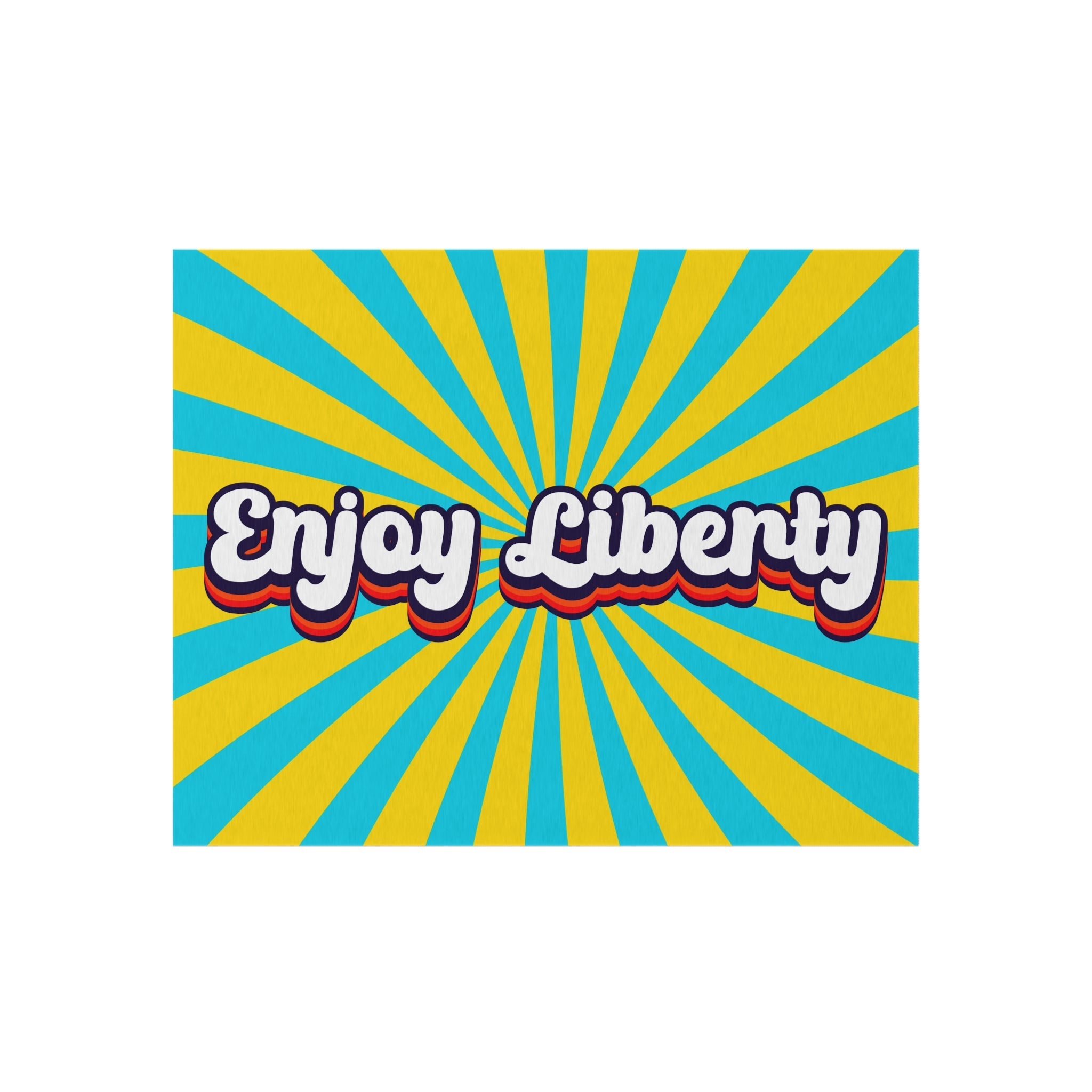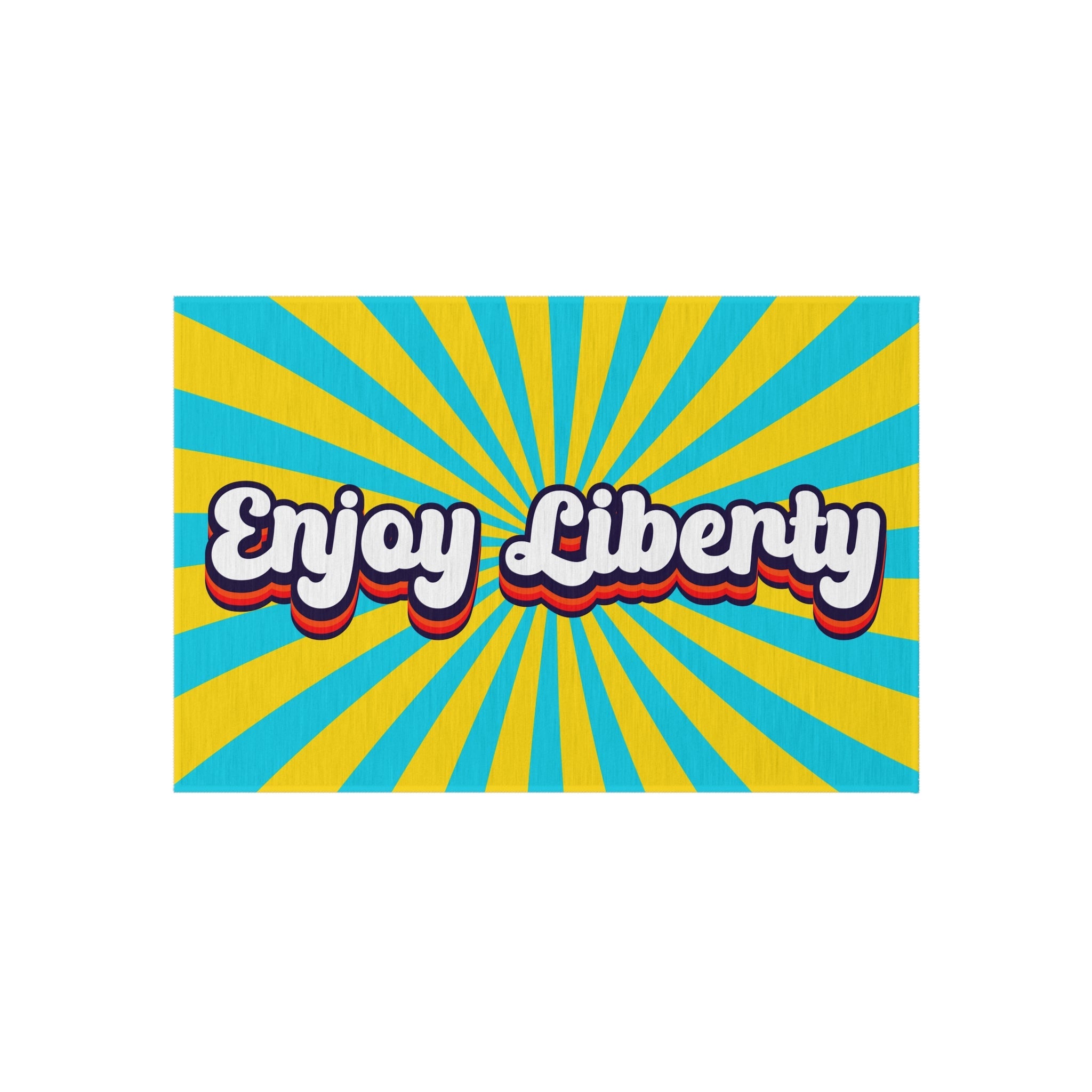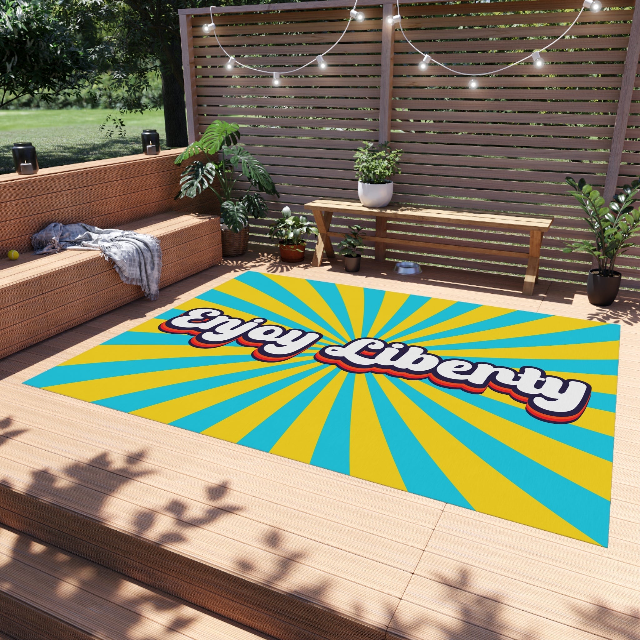 Featuring a vibrant retro design that screams "Enjoy Liberty" in bold letters, this rug is a fantastic way to showcase your love for freedom and individuality. Made from durable and easy-to-clean materials, this outdoor rug is perfect for all your backyard barbecues, pool parties, or just lounging in the sun with your favorite libertarian literature.