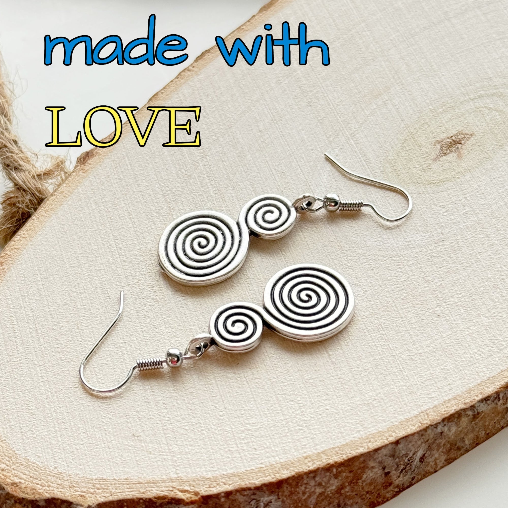 - Earrings are: about 9/16” x 15/16" on silver tone earwires, featuring spiral infinity charm