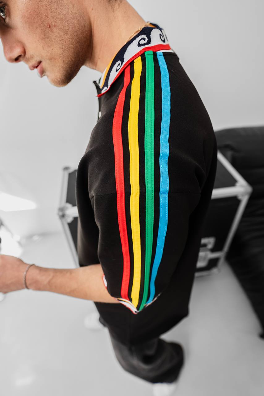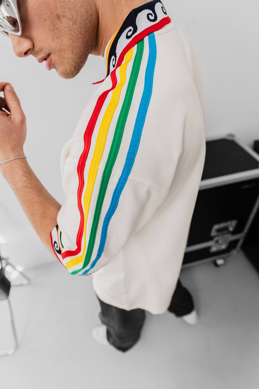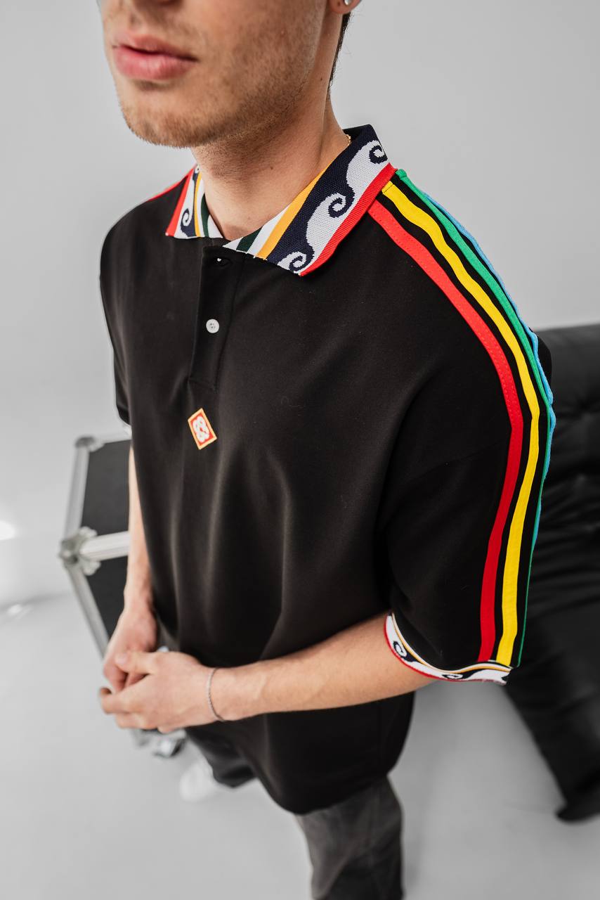 Stand out with this Ethnic Trim Oversized Polo T-Shirt, featuring bold multicolor shoulder stripes and intricate ethnic patterns on the collar and sleeve hems. Designed for unisex wear, this statement piece combines traditional patterns with modern streetwear aesthetics.