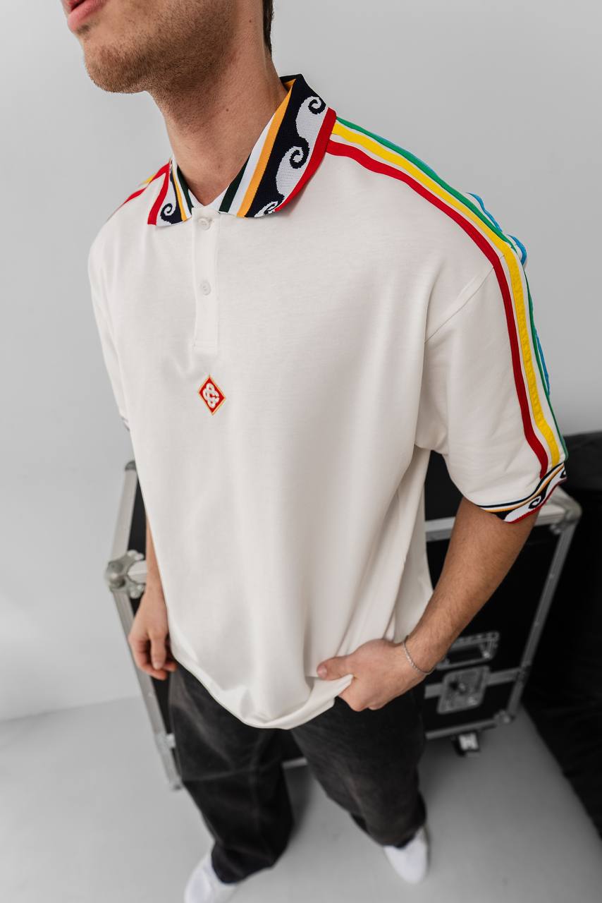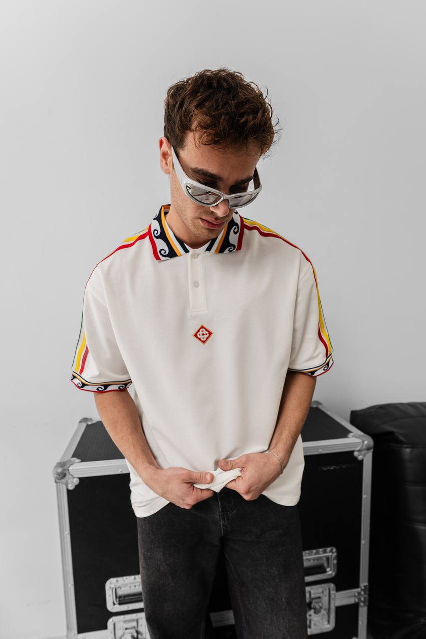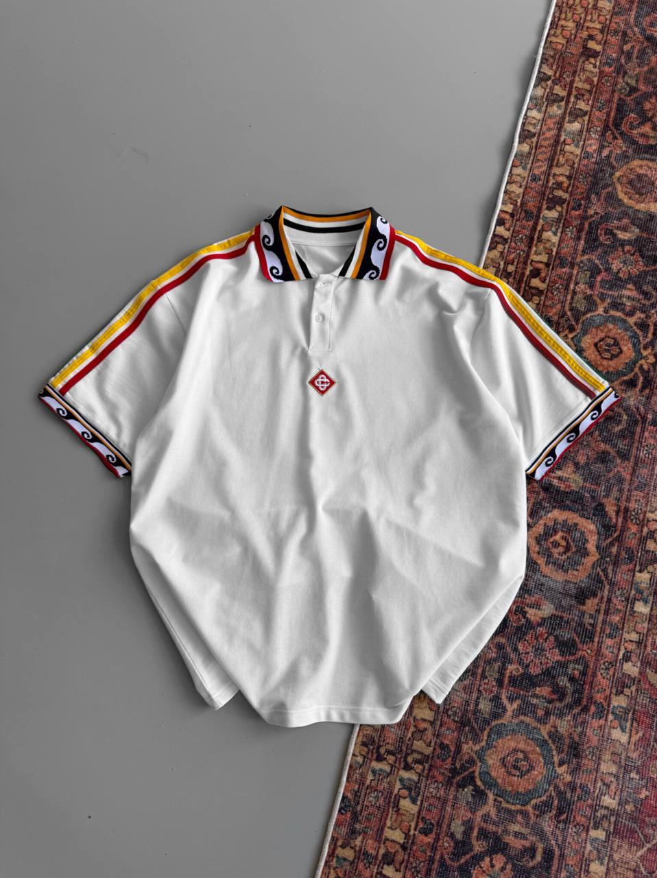 Ethnic Trim Oversized Polo T-Shirt – Unisex White Streetwear