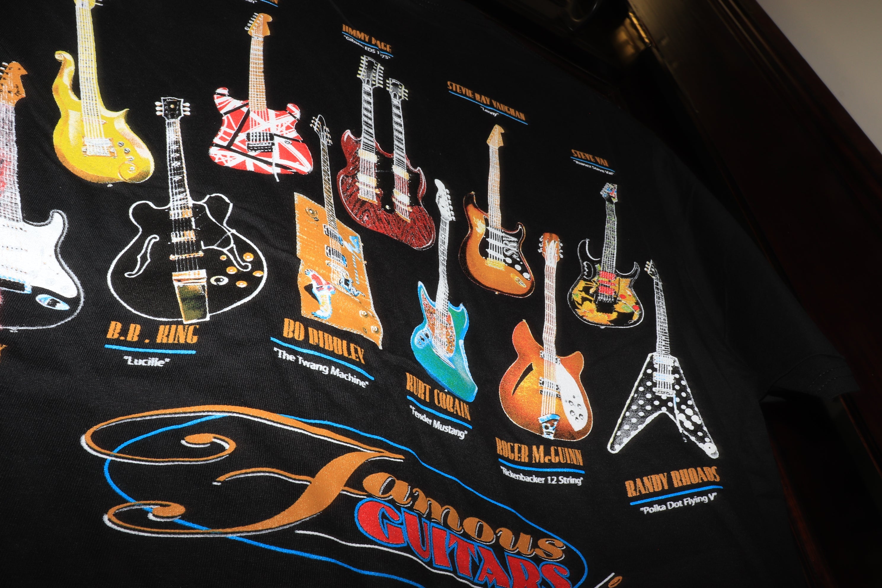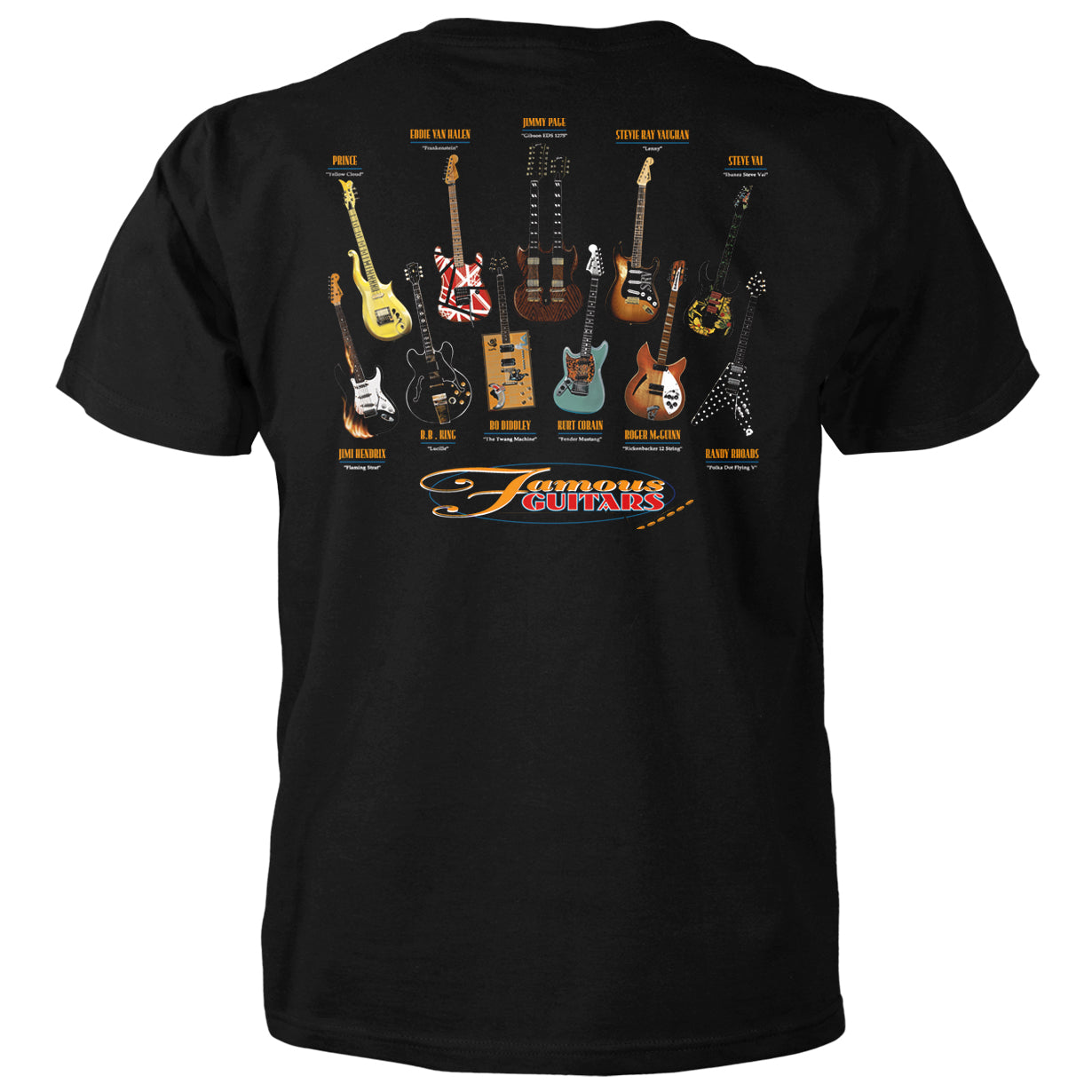 Looking for a way to show off your passion for music in style? Look no further than our "Famous Guitars" t-shirt! This awesome shirt features some of the most iconic instruments in music history, including Hendrix's flaming Strat, BB King's legendary Lucille, Van Halen's Frankenstein, and more!