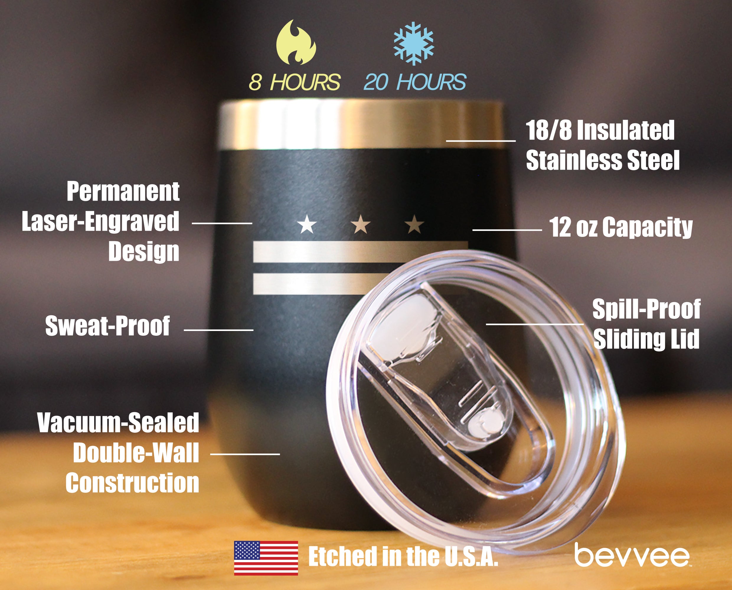 Our 12oz. stemless wine tumblers with sliding lids feature stainless steel double-wall construction, vacuum insulated for 2X cold and heat retention compared to glass or plastic containers! Etched in America.