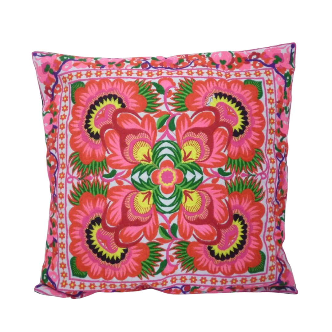 Add a pop of color and fun to any room with our collection of Hmong inspired embroidered pillow covers. Lovingly handmade in Thailand by our artisan partners following fair trade guidelines using colorful floral embroidery.