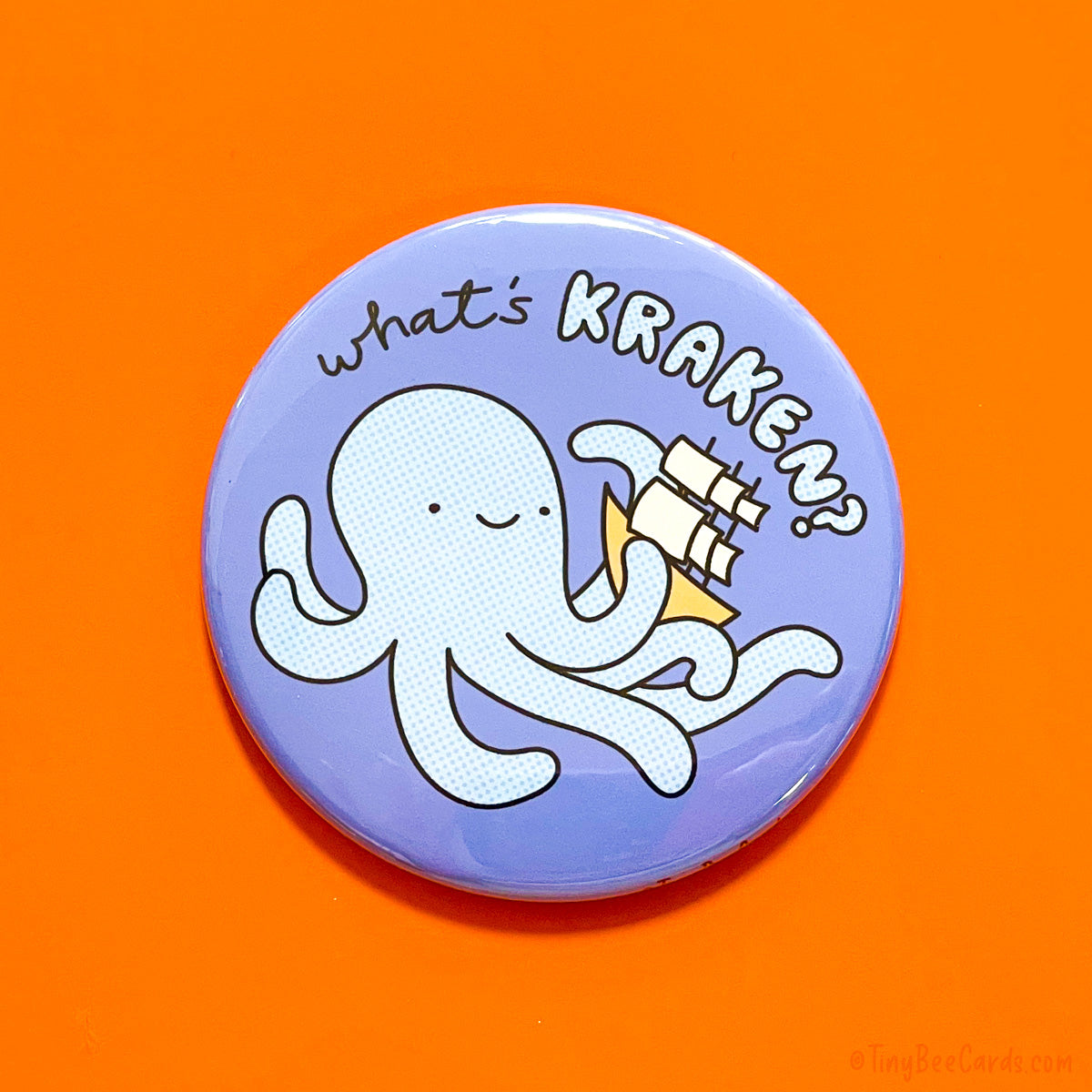 Our buttons make awesome stocking stuffers, gifts, or party favors! Perfect for friends or for your significant other on Valentine's day, anniversary or birthday. Design features an adorable kraken with a ship and the pun "What's Kraken?"