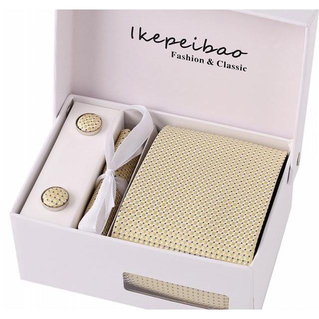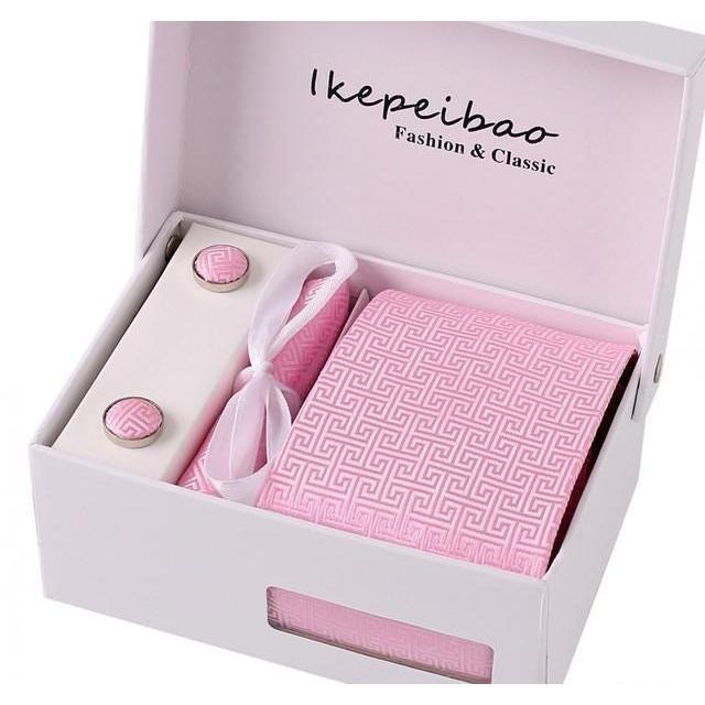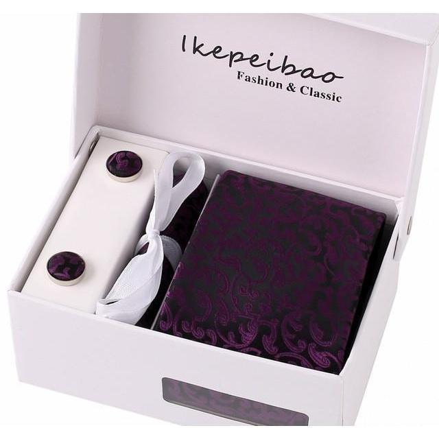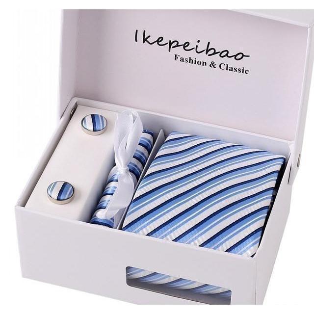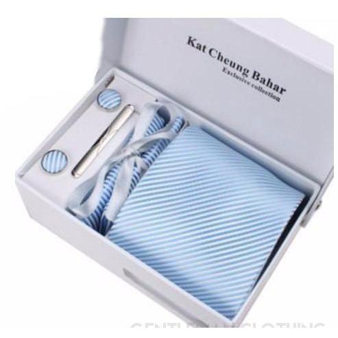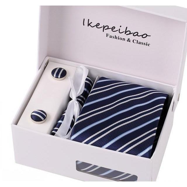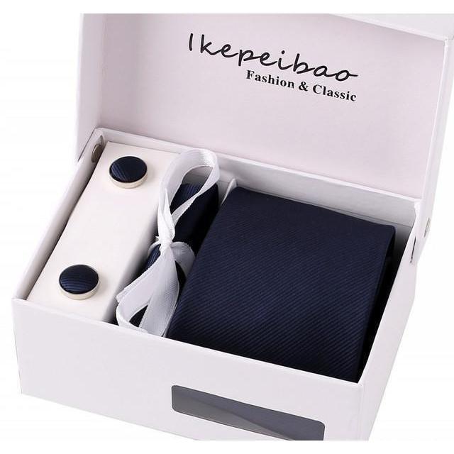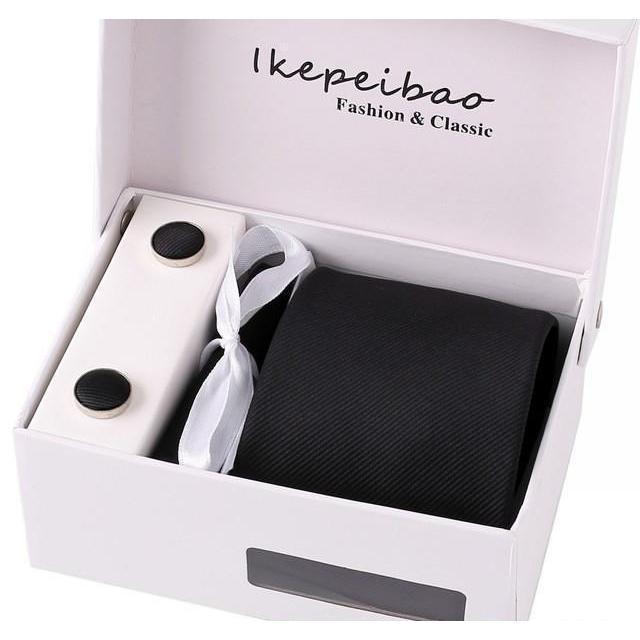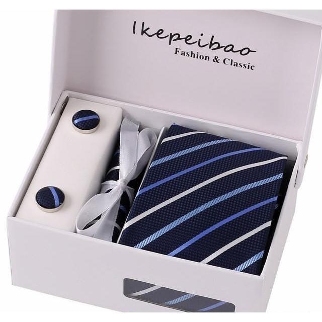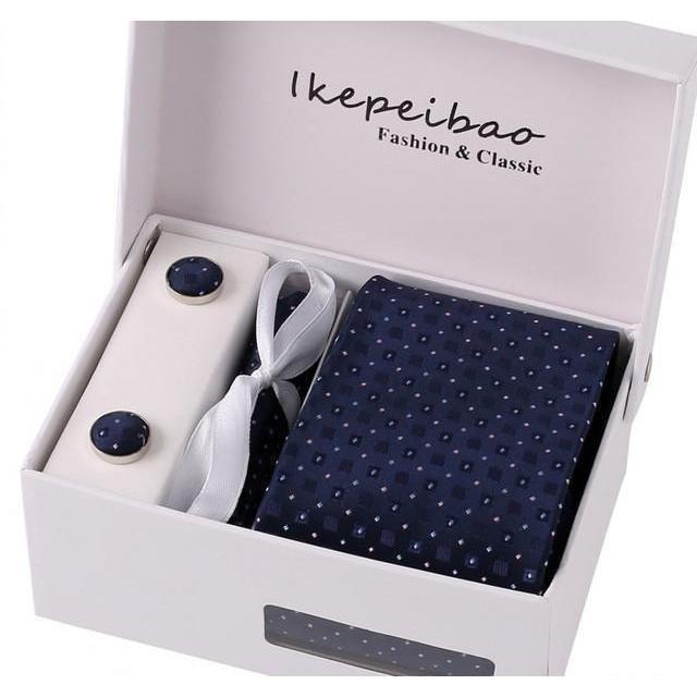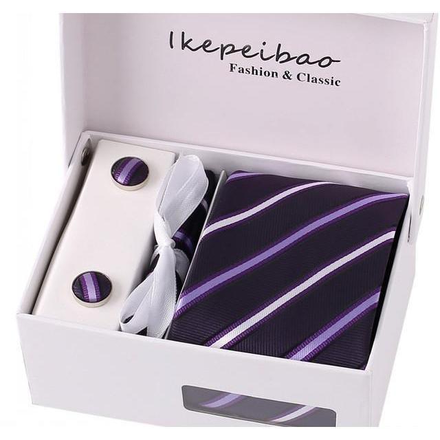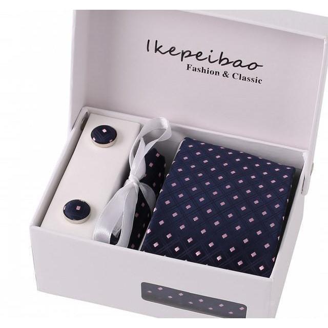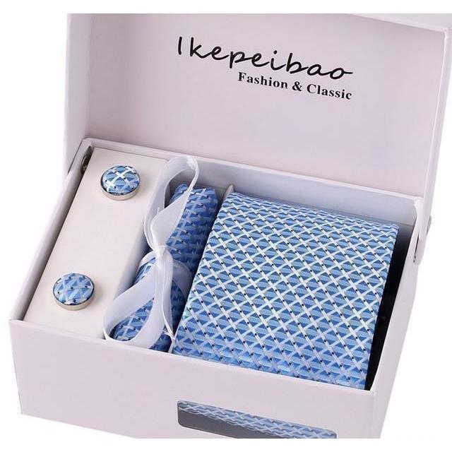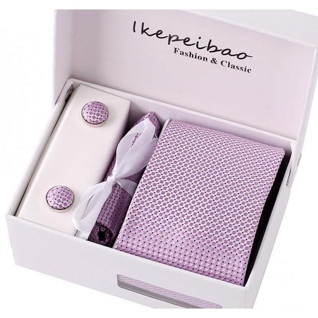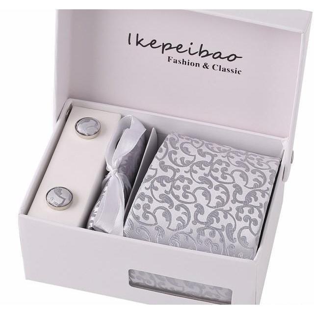 Set Includes 1 Wide Necktie, 1 Set of Cufflinks, 1 Tie Clip, 1 Pocket Square all packed in a elegant gift box.