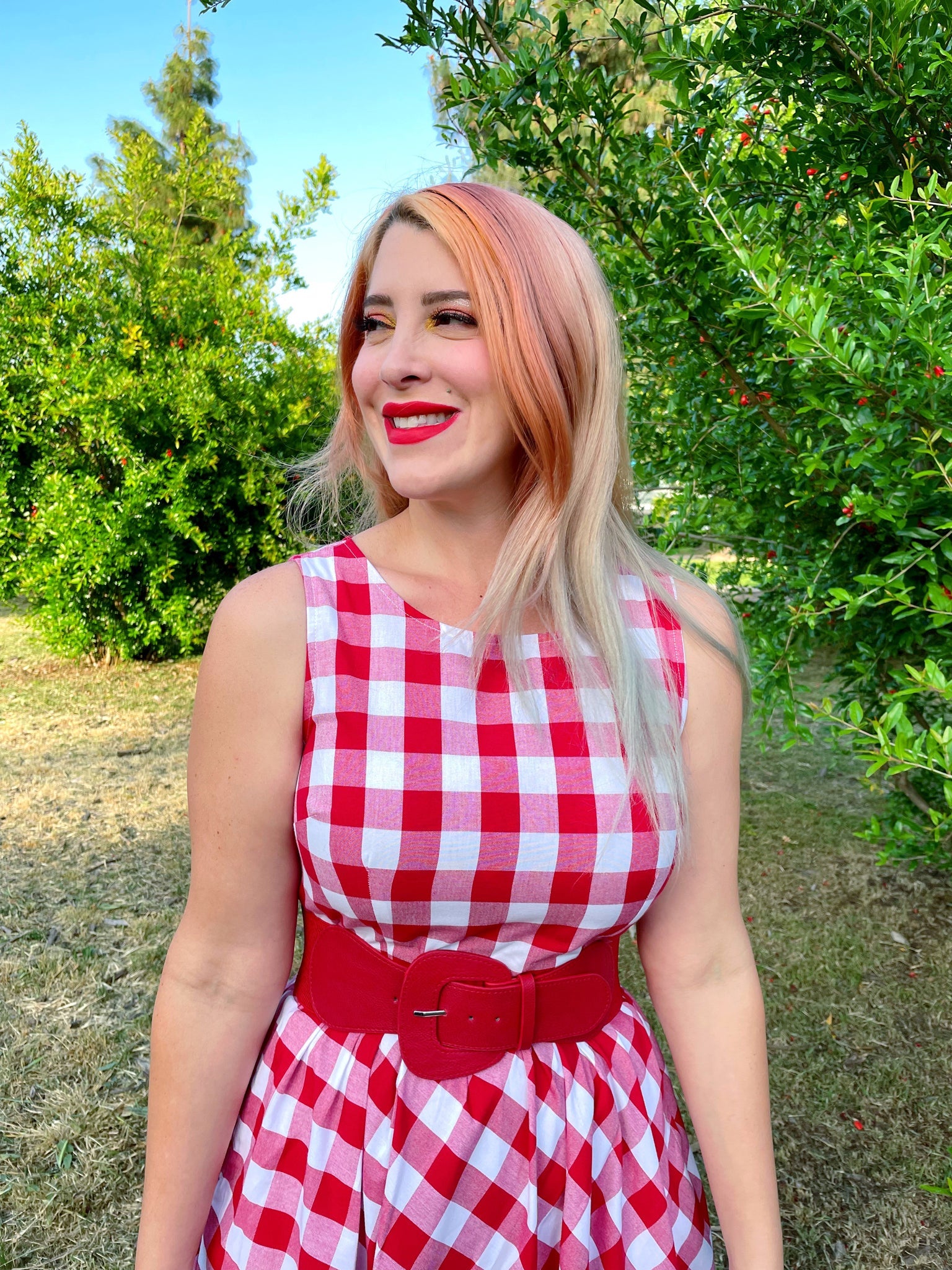 A vintage style piece with fun, modern details; our midi dress is now available in our adorable red gingham. Made from 100% cotton, this classic 1950's inspired dress features a high neckline, longer length swing skirt with hidden side pockets, and back zippered closure. Shown with the retro style cinch belt in red.