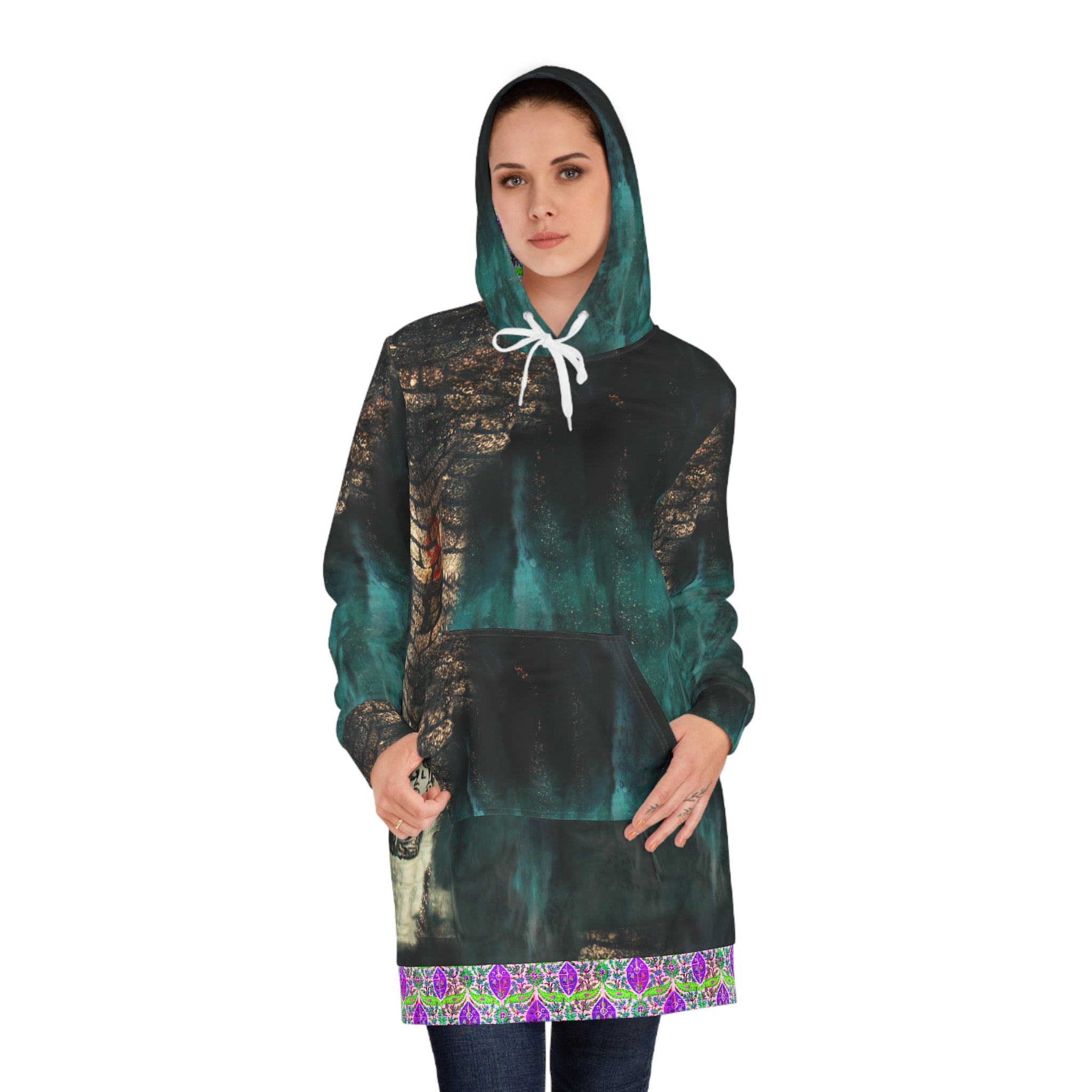 Stay cozy and stylish on cold and rainy days with this custom-made hoodie dress. It features a long hood that is perfect for fall, winter, or any chilly day. Plus, it's adorned with a unique David Williams mixed media print from the 2014 street art homage collection.