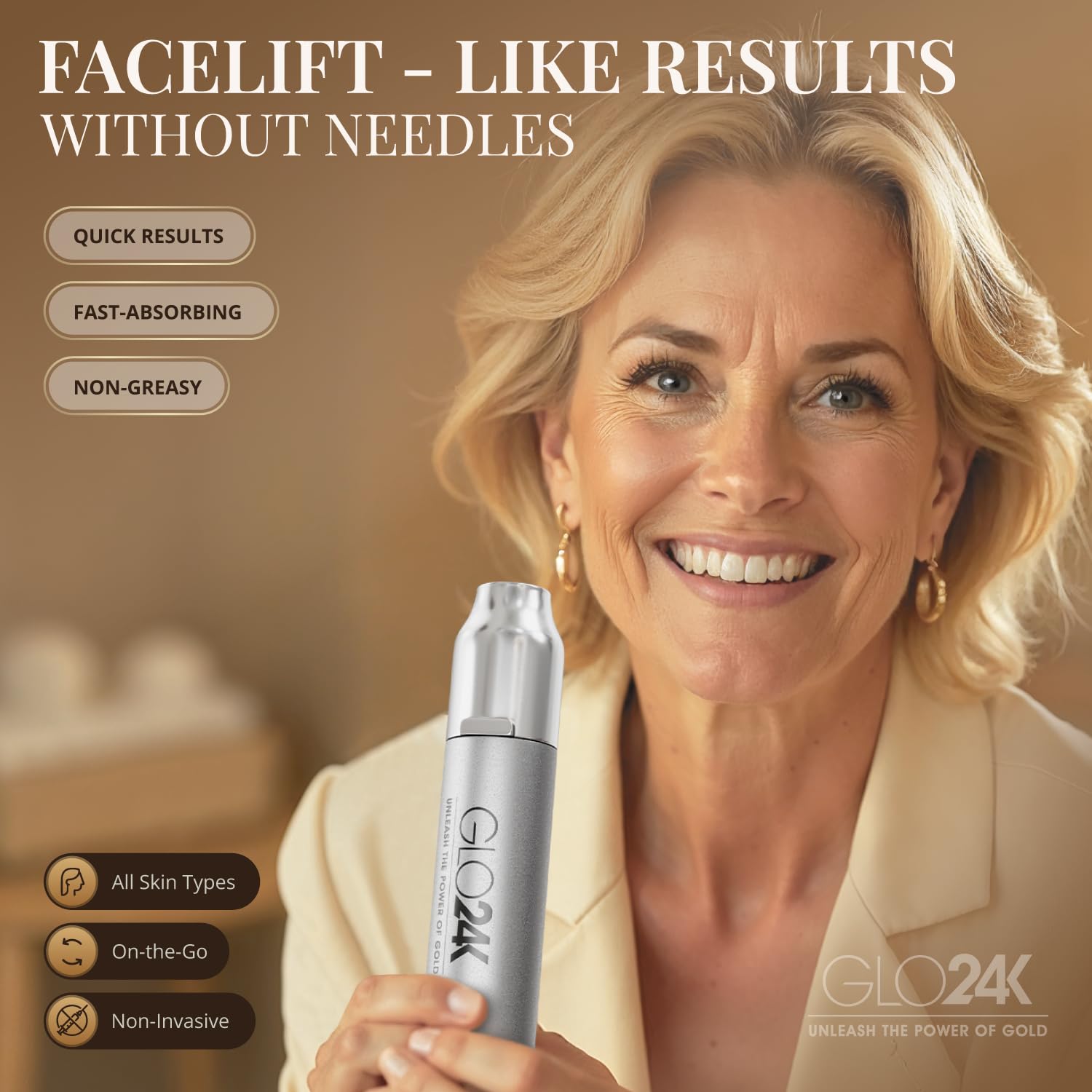 - Easy to Apply Under Eyes and Face: GLO24K non-invasive Instant Wrinkle Filler & Lifting Cream, in an exclusive no-needle applicator for an accurate dosage and application over areas of concern, injects powerful anti-aging ingredients onto the skin for Instant Facelift and wrinkle filling effects.