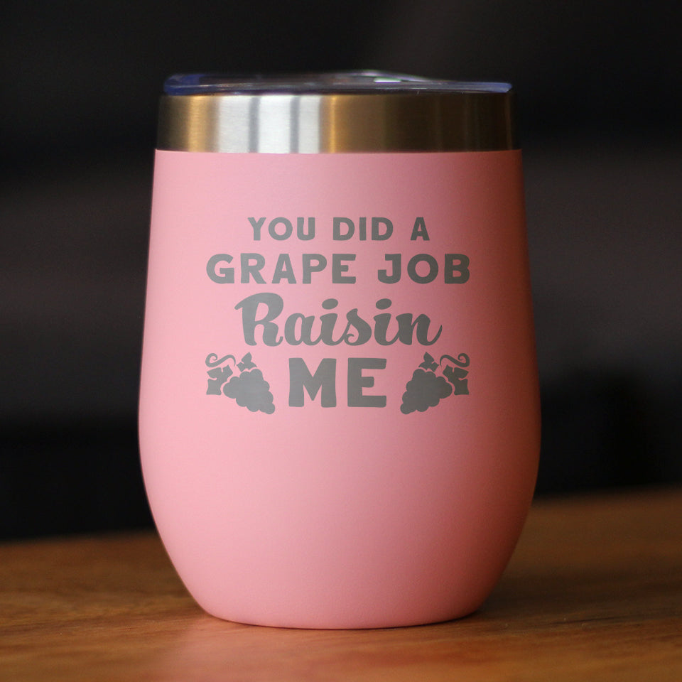 Grape Job Raisin Me - Wine Tumbler Gift for Mom - Cute Funny Wine Gift Idea - Unique Personalized Glasses for Mother's Day or Birthday ‐ Pink