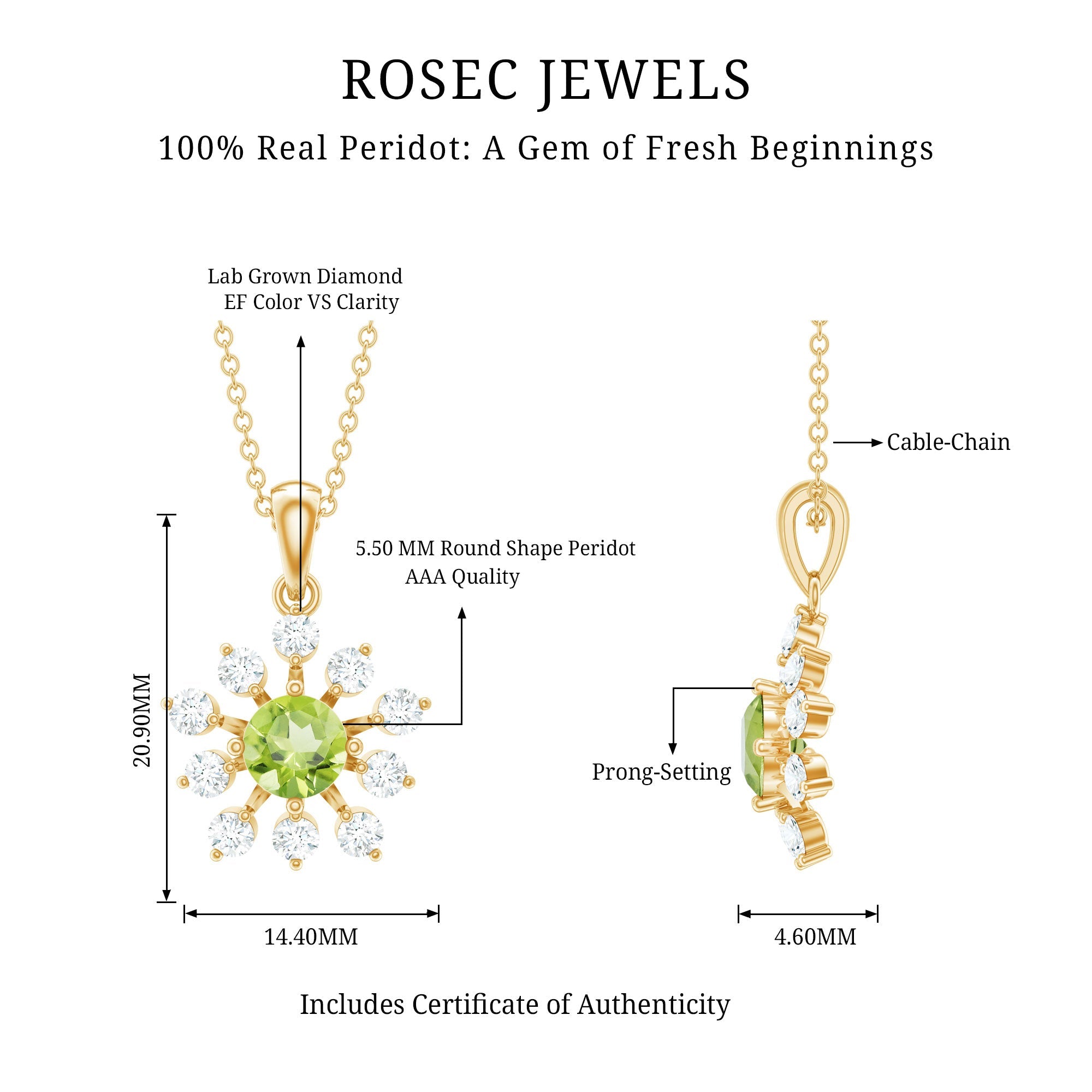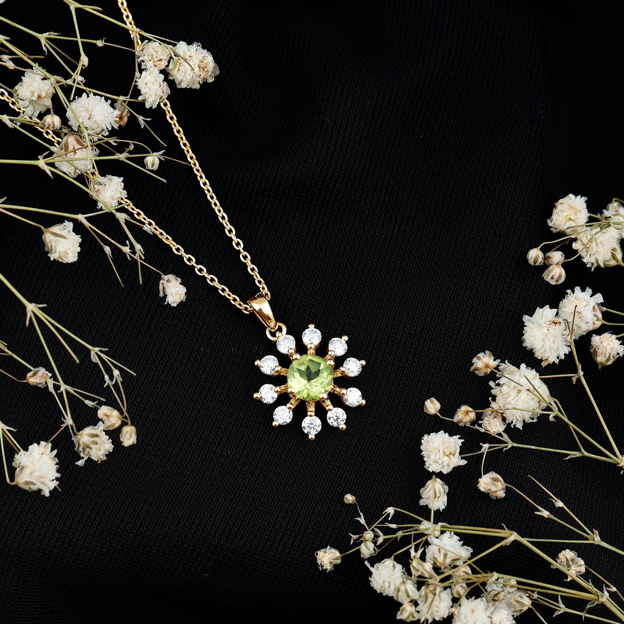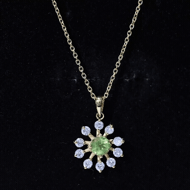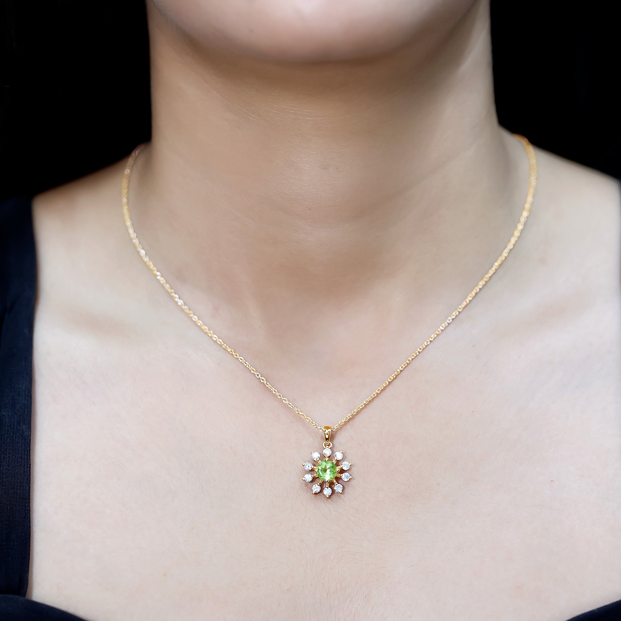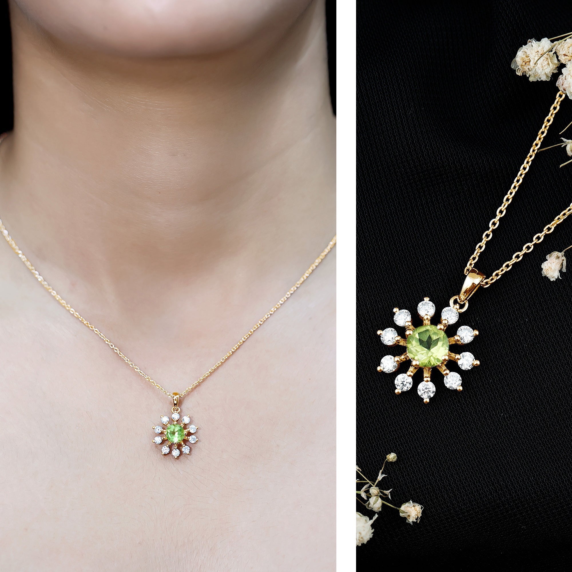 This Peridot Necklace Pendant is designed to carry positive energy, reminding you to move through life with confidence, kindness, and a calm heart. Handcrafted in 14k yellow gold plated silver, the Floral Pendant features a round brilliant cut peridot set securely in a prong setting. The design is surrounded by delicate round lab grown diamonds placed to add just the right touch of sparkle. The Silver Peridot Necklace hangs from a fine cable chain that is both strong and comfortable. It closes with a lobster clasp and offers adjustable length for a perfect fit. As the birthstone for August, peridot has long been seen as a symbol of strength, clarity, and good luck. Whether you are gifting it to someone you love or treating yourself, this August Birthstone Necklace is more than just a beautiful accessory, it is a thoughtful way to mark a birthday, celebrate a fresh start, or simply wear something that feels good. Packaged in a signature jewelry box and paired with a certificate of authenticity, this necklace is ready to gift, wear, and treasure.