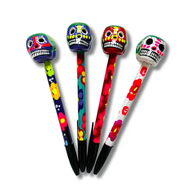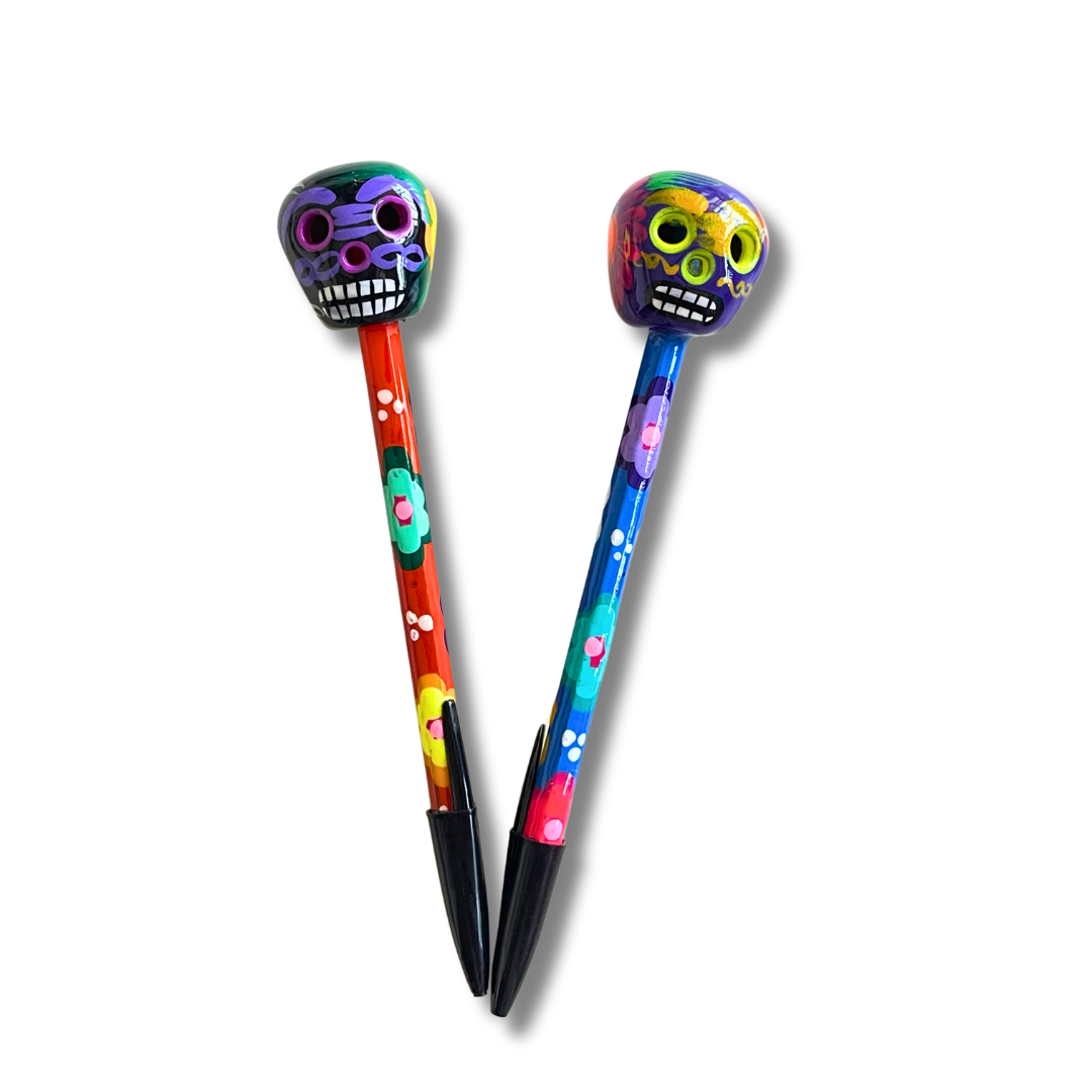 Add a burst of color to your writing with this Sugar Skull Hand-Painted Pen, crafted by the talented Cecilia in Mexico. Each pen features a vibrant sugar skull design on top and a floral-patterned body, showcasing intricate hand-painted details that celebrate Mexican artistry. Perfect as a gift or a unique desk accessory, these pens are as functional as they are beautiful. Each one is truly one-of-a-kind!