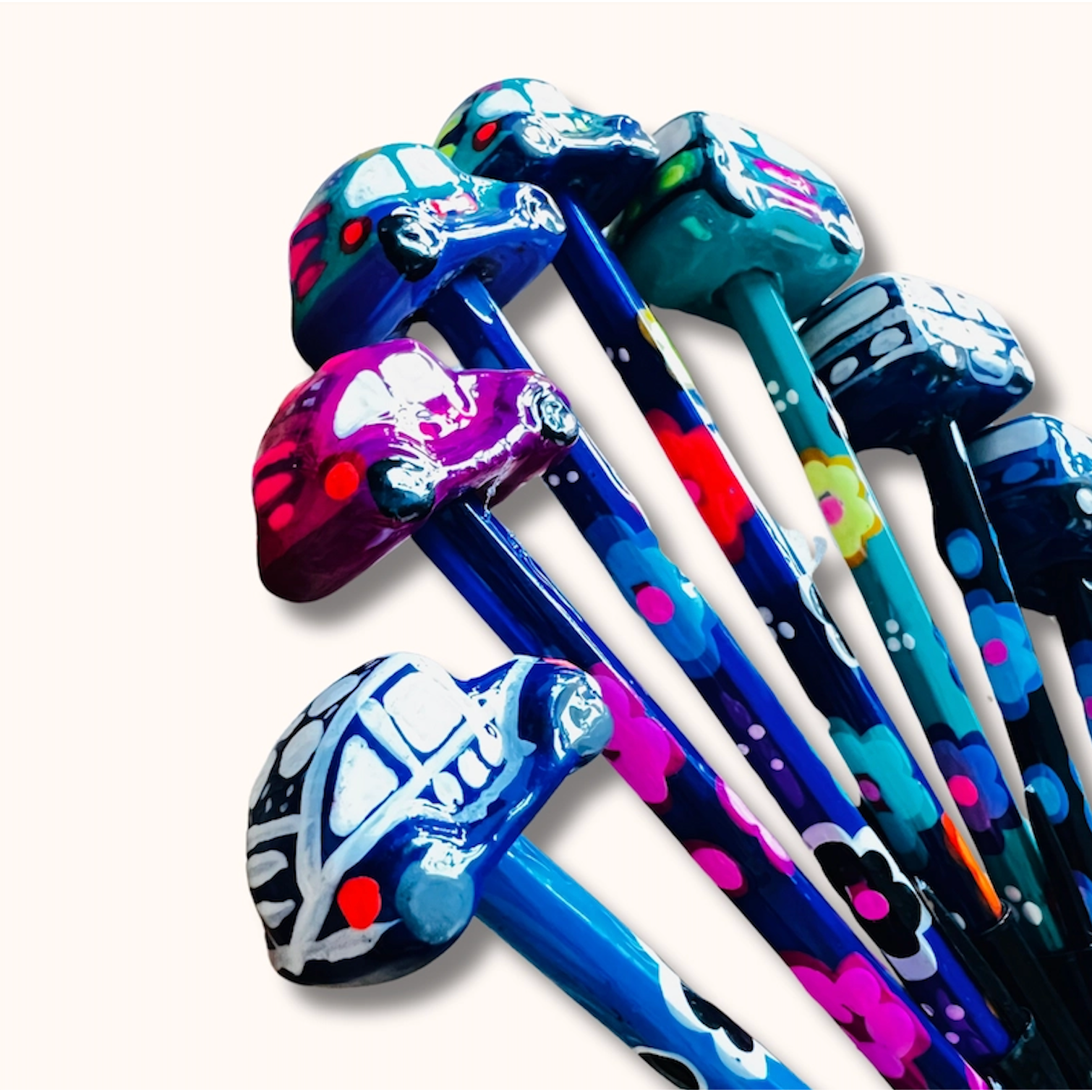 Add a pop of personality to your writing with this VW Bug Hand-Painted Pen, crafted by the talented Cecilia in Mexico. Each pen features a colorful VW Bug design, showcasing intricate hand-painted details that celebrate Mexican artistry. Perfect as a gift or a unique desk accessory, these pens are as functional as they are beautiful.