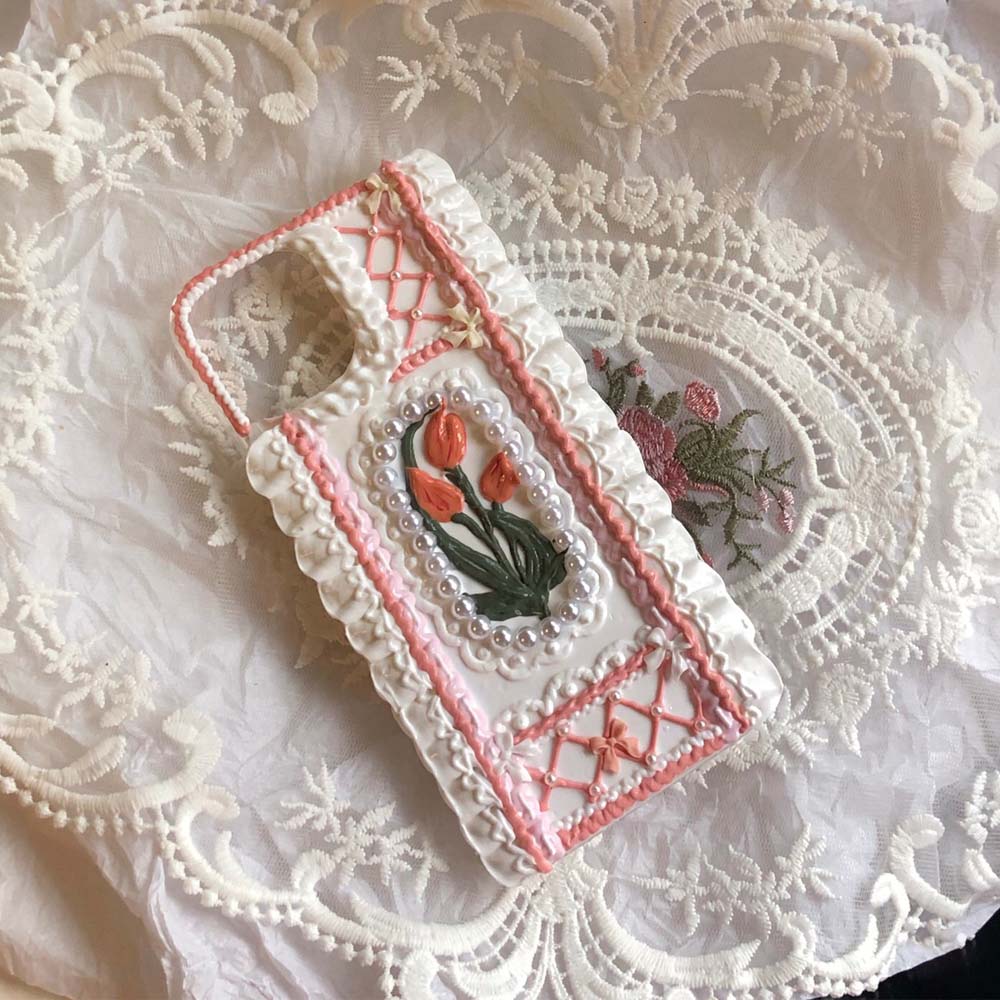 Handmade Tulip 3D oil painting retro cream mobile phone case (customizable) | ZAKAPOP ‐ Tulip&Lace / iPhone X
