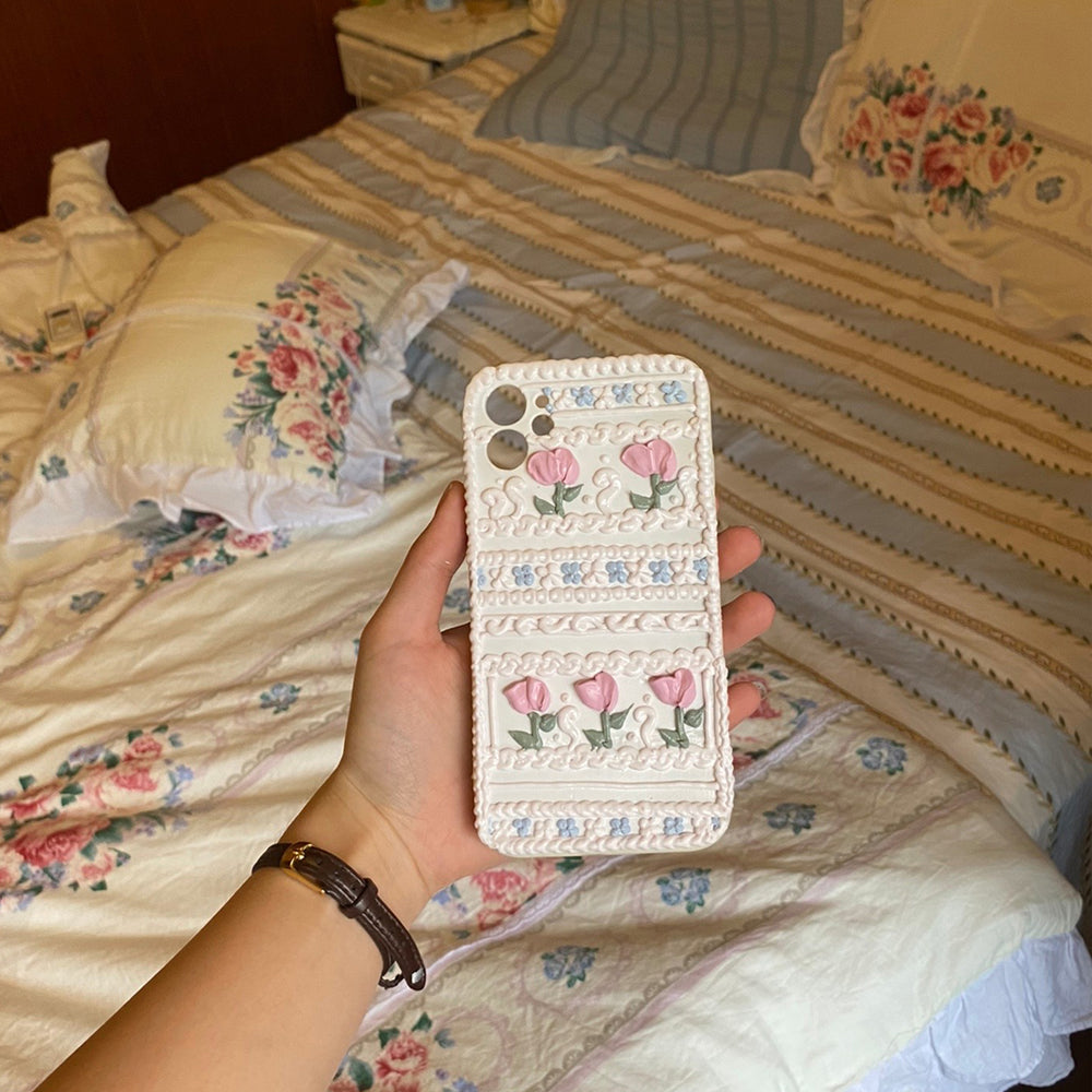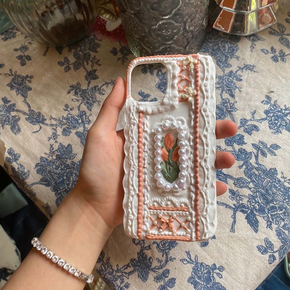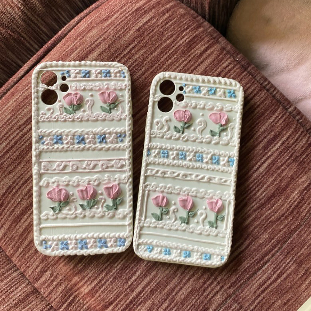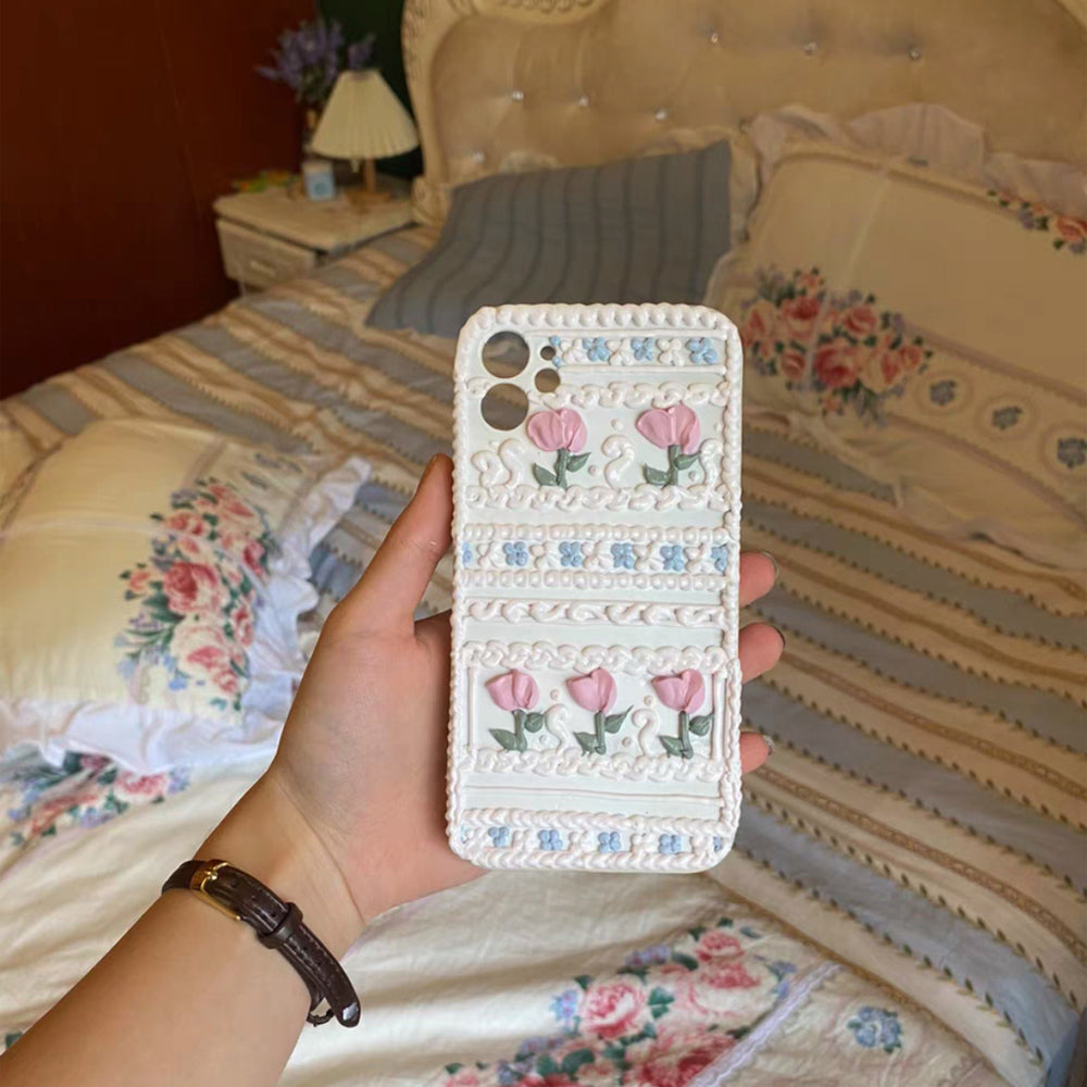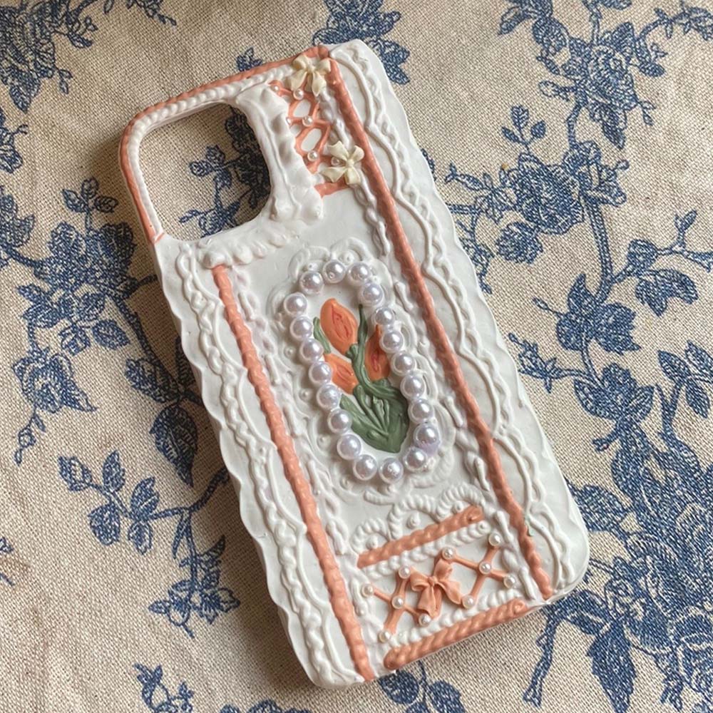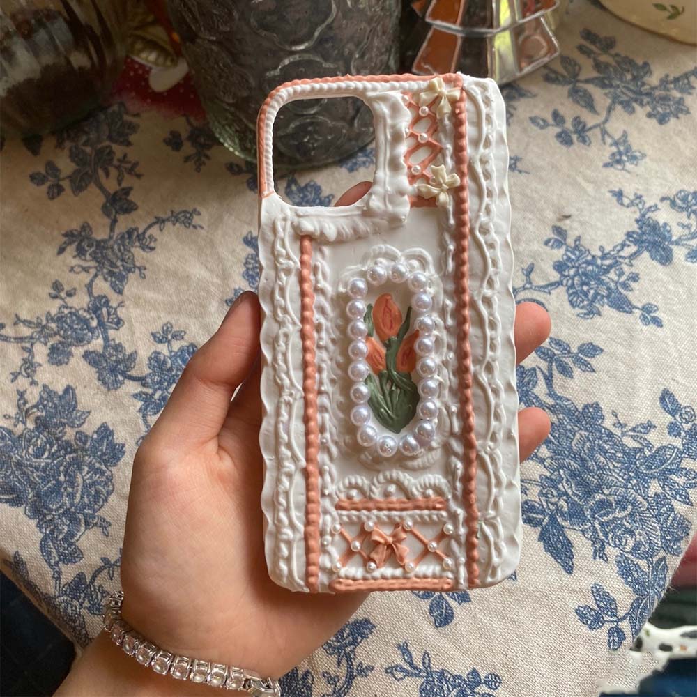 Handmade Tulip 3D oil painting retro cream mobile phone case (customizable) | ZAKAPOP ‐ Tulip&Lace / Other Phone Type