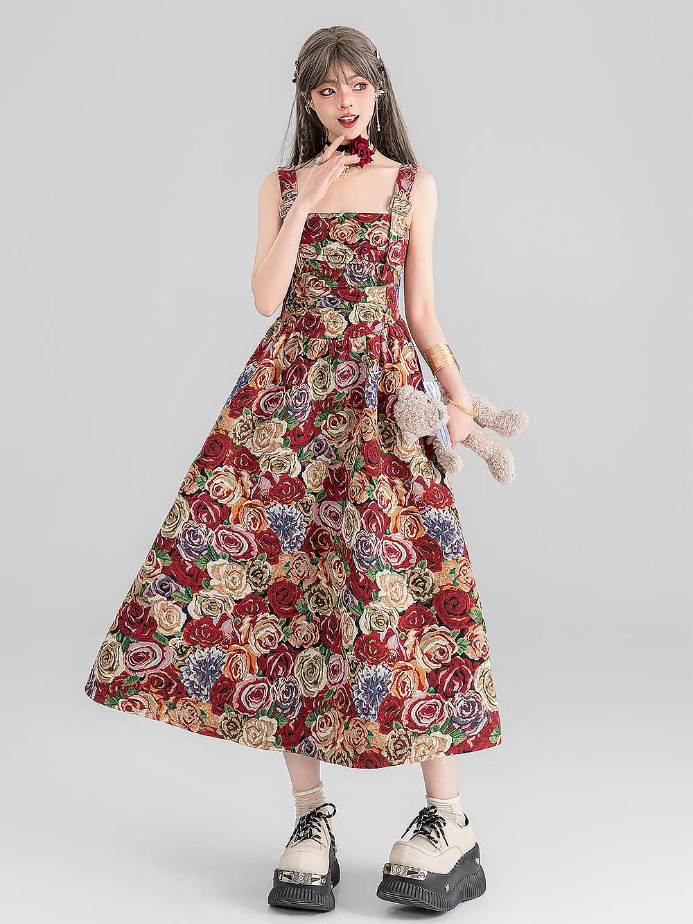 High-End Jacquard Oil Painting Style Pinafore Dress | ZAKAPOP ‐ Flowers Long Dress / S