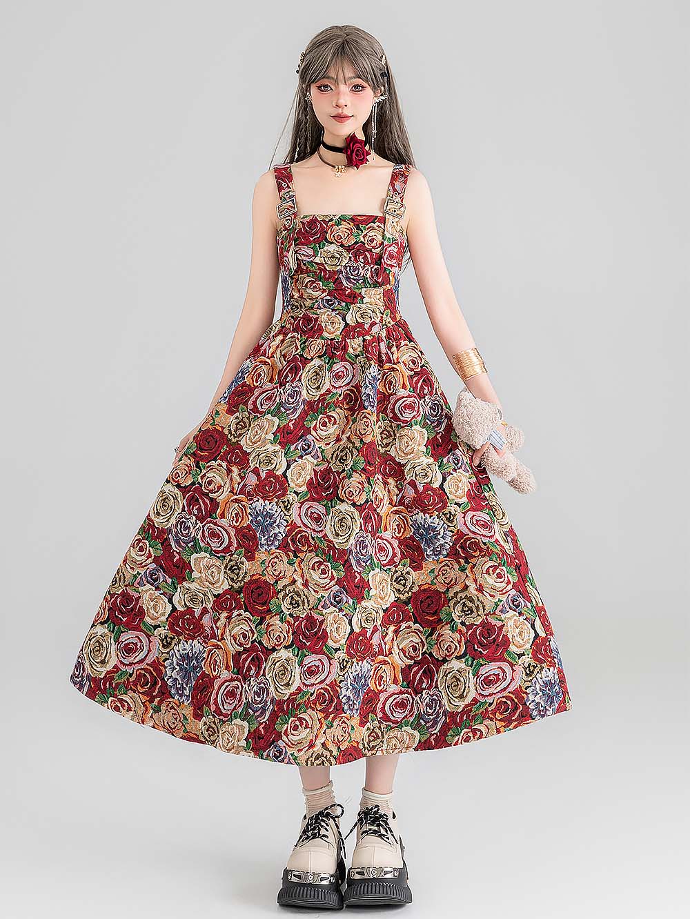High-End Jacquard Oil Painting Style Pinafore Dress | ZAKAPOP ‐ Flowers Long Dress / L