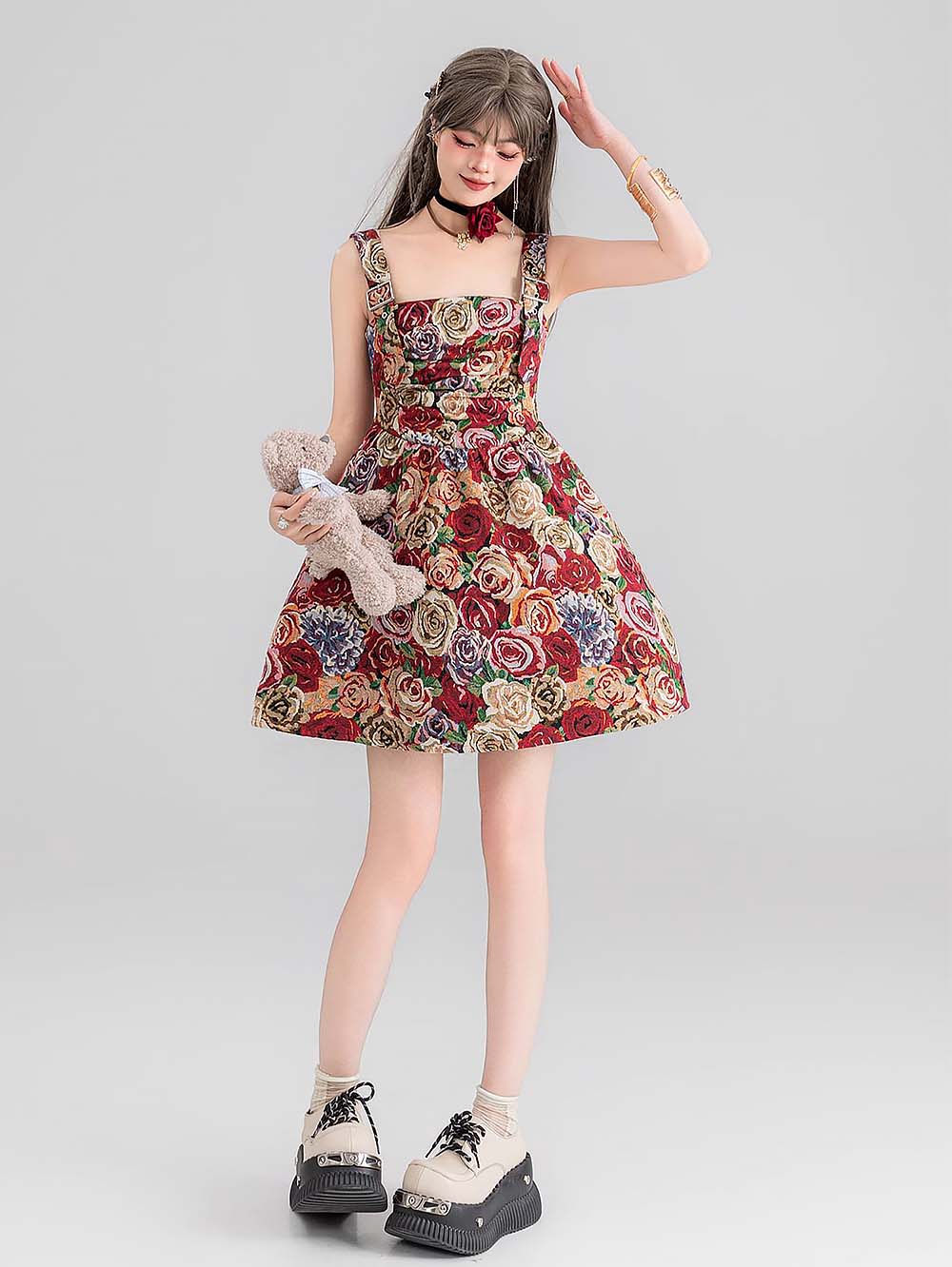 High-End Jacquard Oil Painting Style Pinafore Dress | ZAKAPOP ‐ Flowers Short Dress / XL