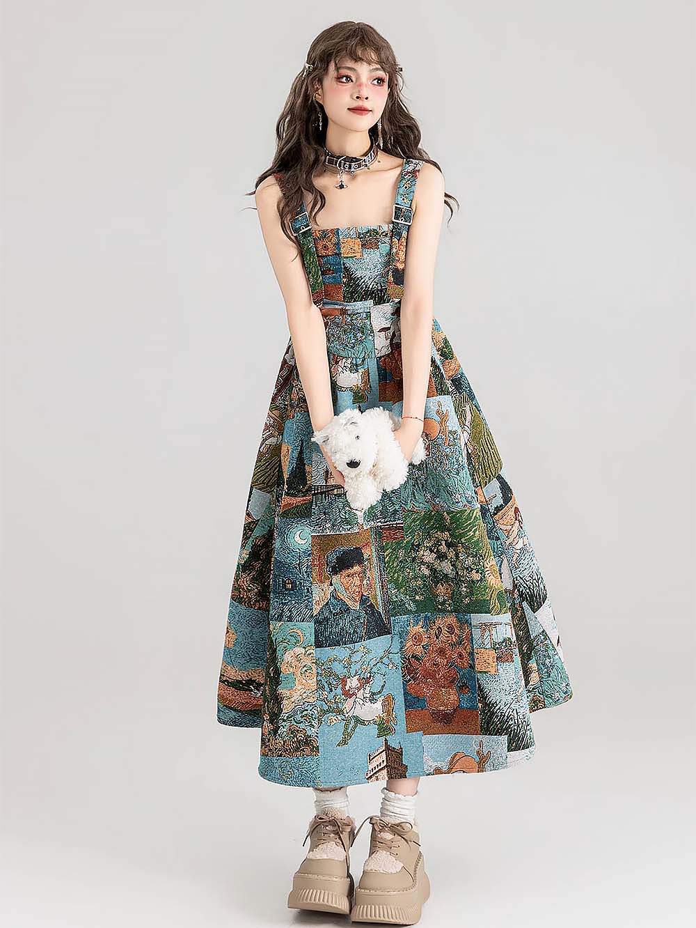 High-End Jacquard Oil Painting Style Pinafore Dress | ZAKAPOP ‐ Artwork Long Dress / S