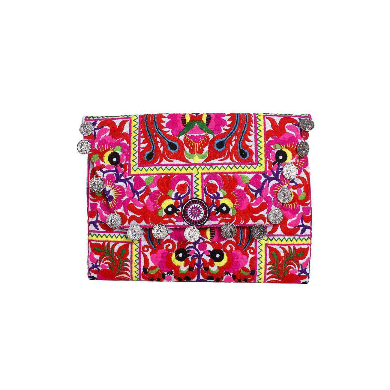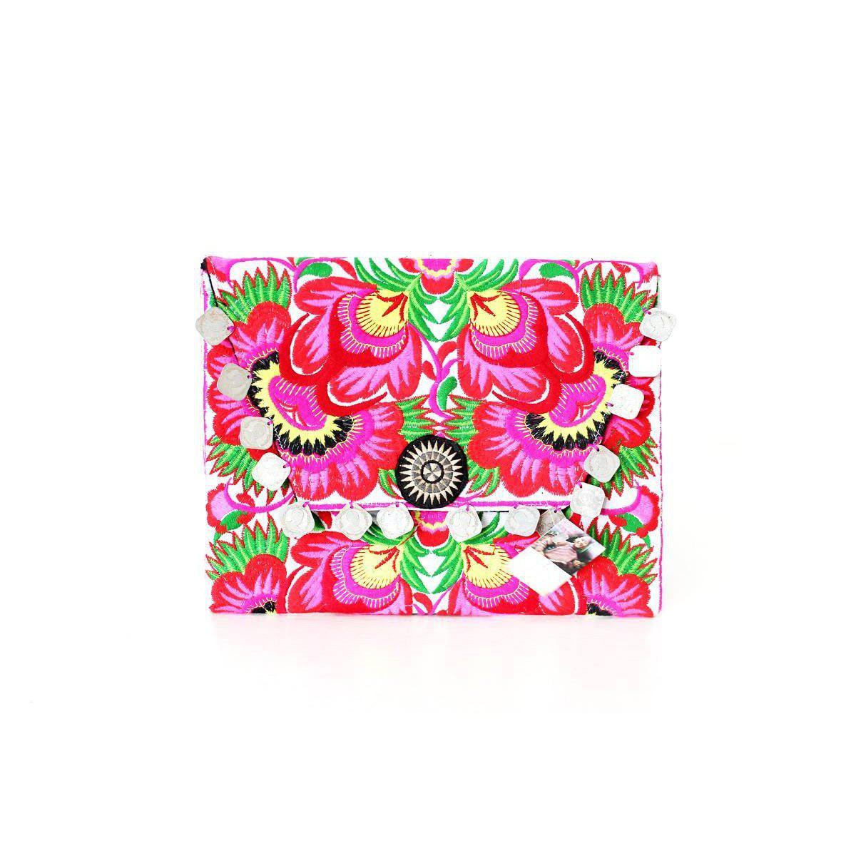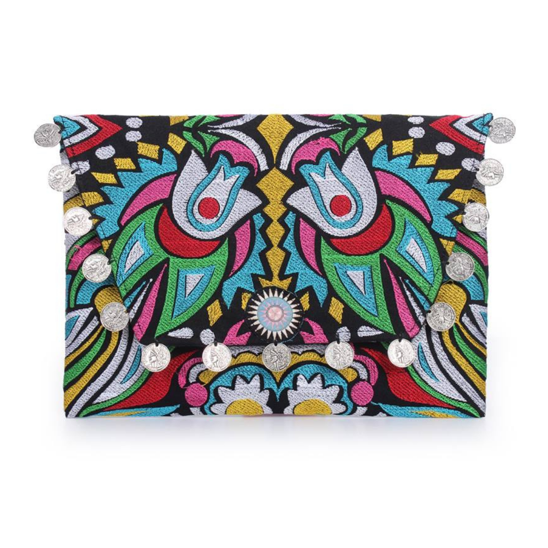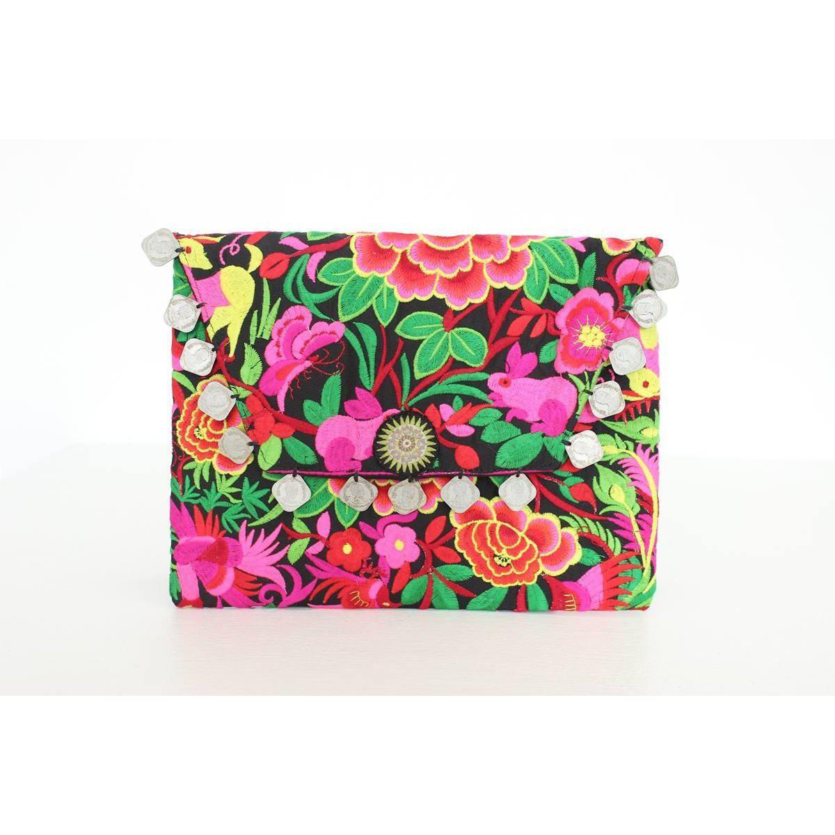 Make a statements with our boho clutch embroidered bag. It is an ethically handmade in Thailand by our artisan partners. Features sustainably sourced materials and cotton lining, adorned with silver coins. Finished with a strong magnetic closure.