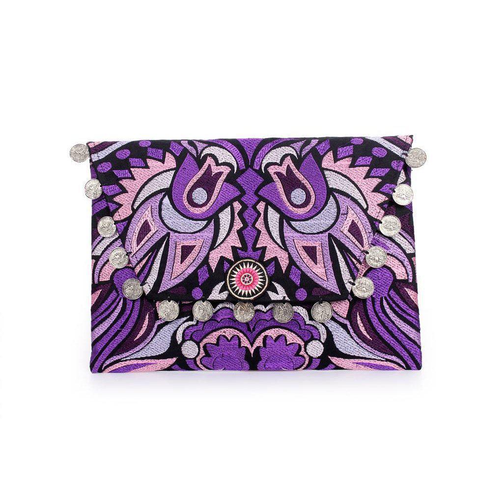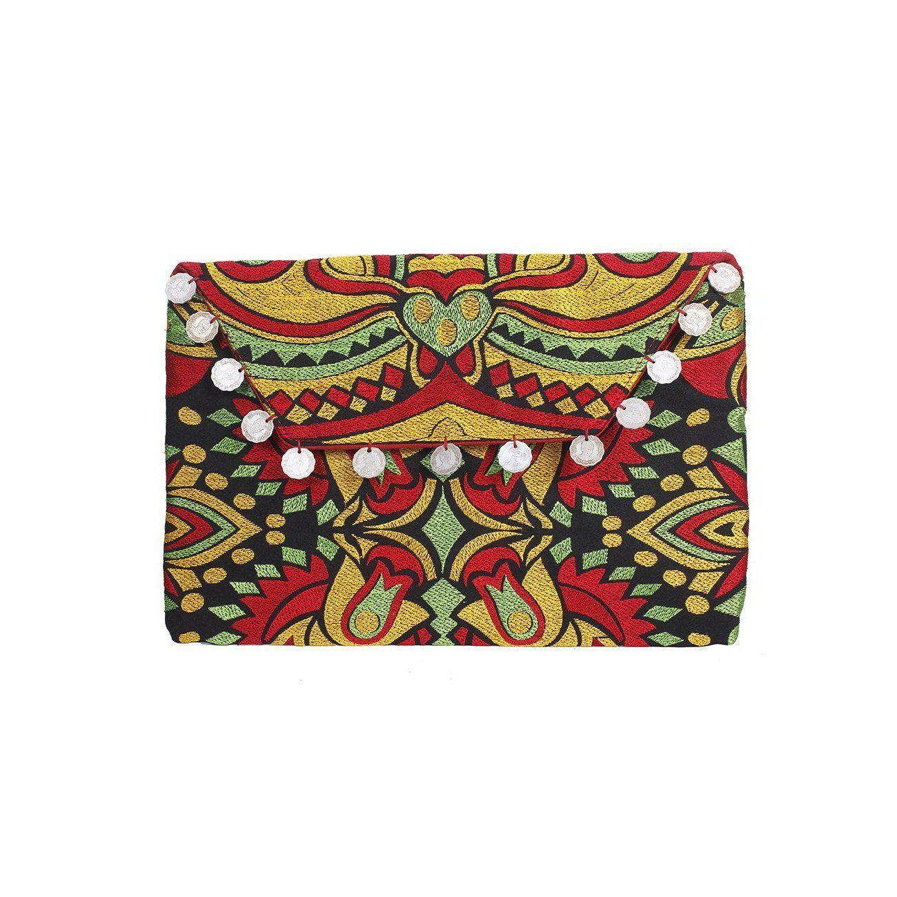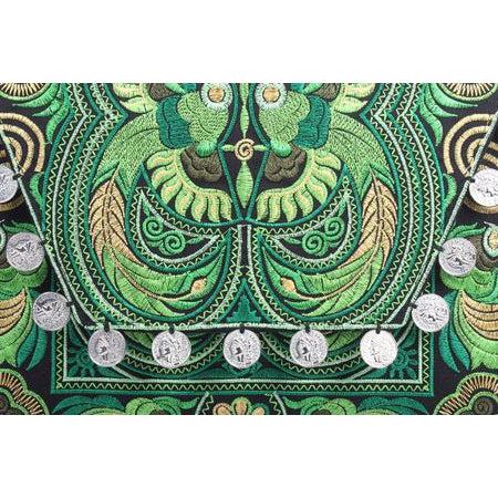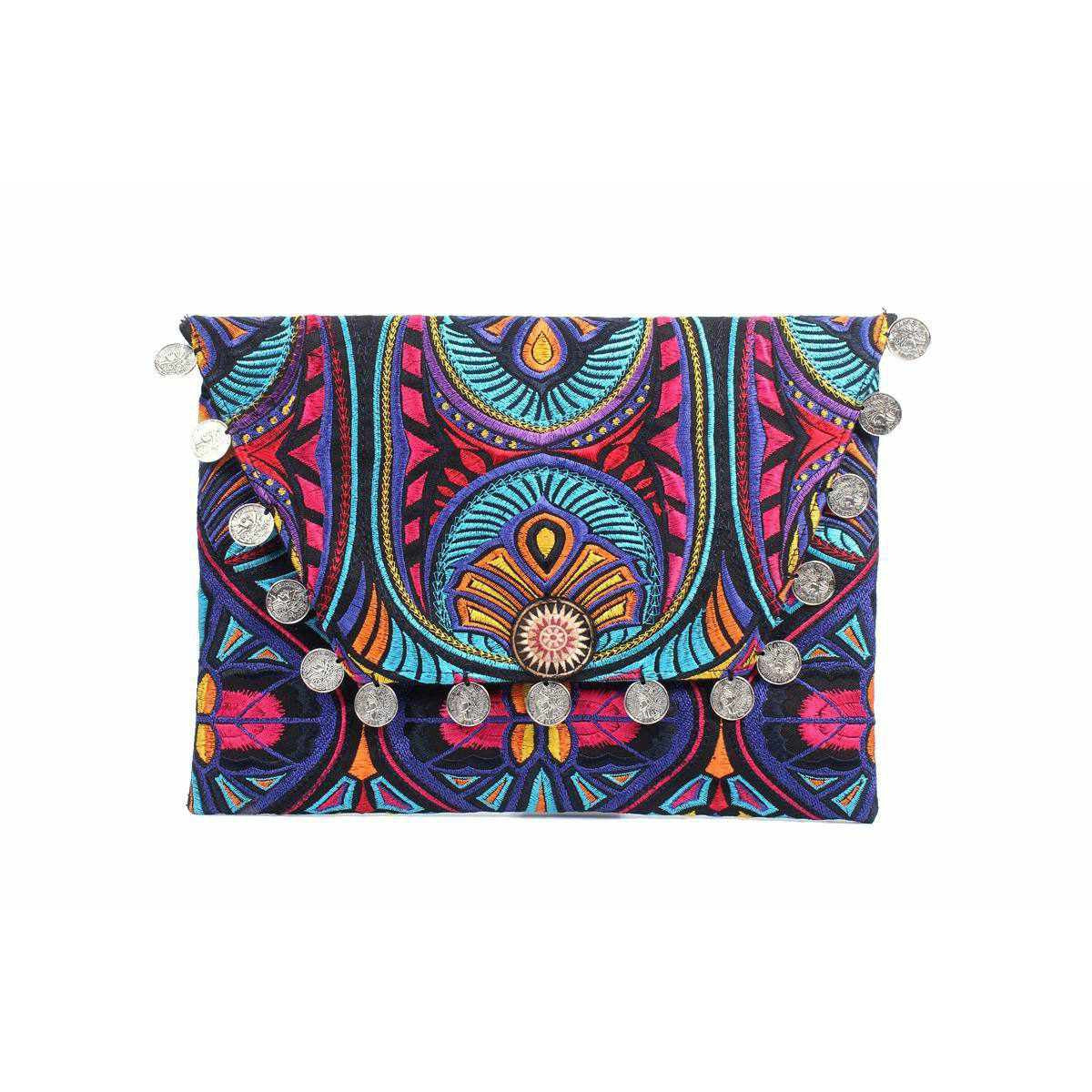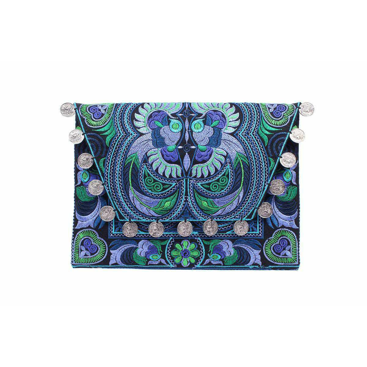 Make a statements with our boho clutch embroidered bag. It is an ethically handmade in Thailand by our artisan partners. Features sustainably sourced materials and cotton lining, adorned with silver coins. Finished with a strong magnetic closure.