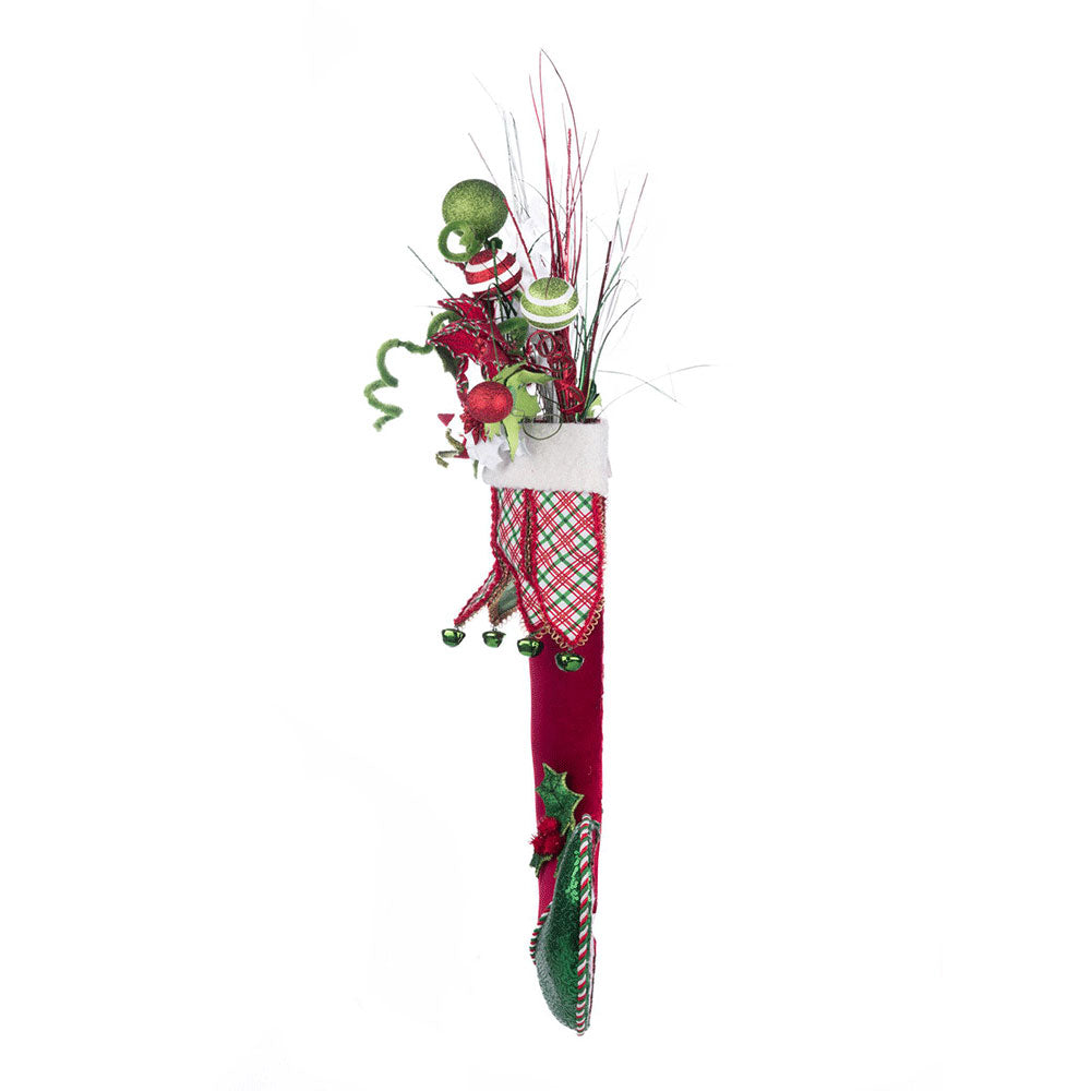 - Fur trimmed velvet stocking with bright green sequin tips bursting with whimsical decorations that add lots of sparkle and jingle bells