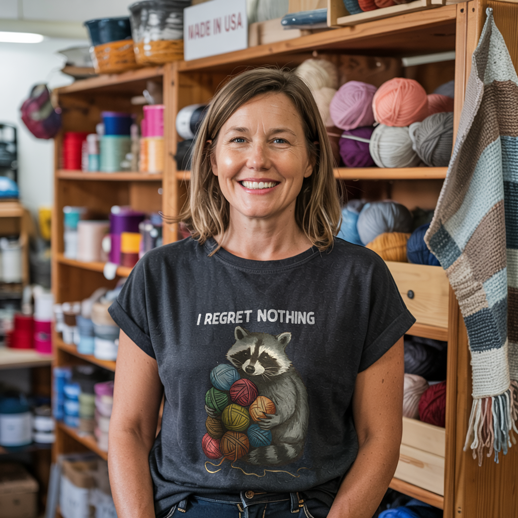 Celebrate unapologetic creativity with this playful and charming tee. Featuring an adorably guilty raccoon hugging a towering hoard of colorful yarn balls under the bold phrase "I REGRET NOTHING," this design is pure joy for fiber artists with a mischievous streak.