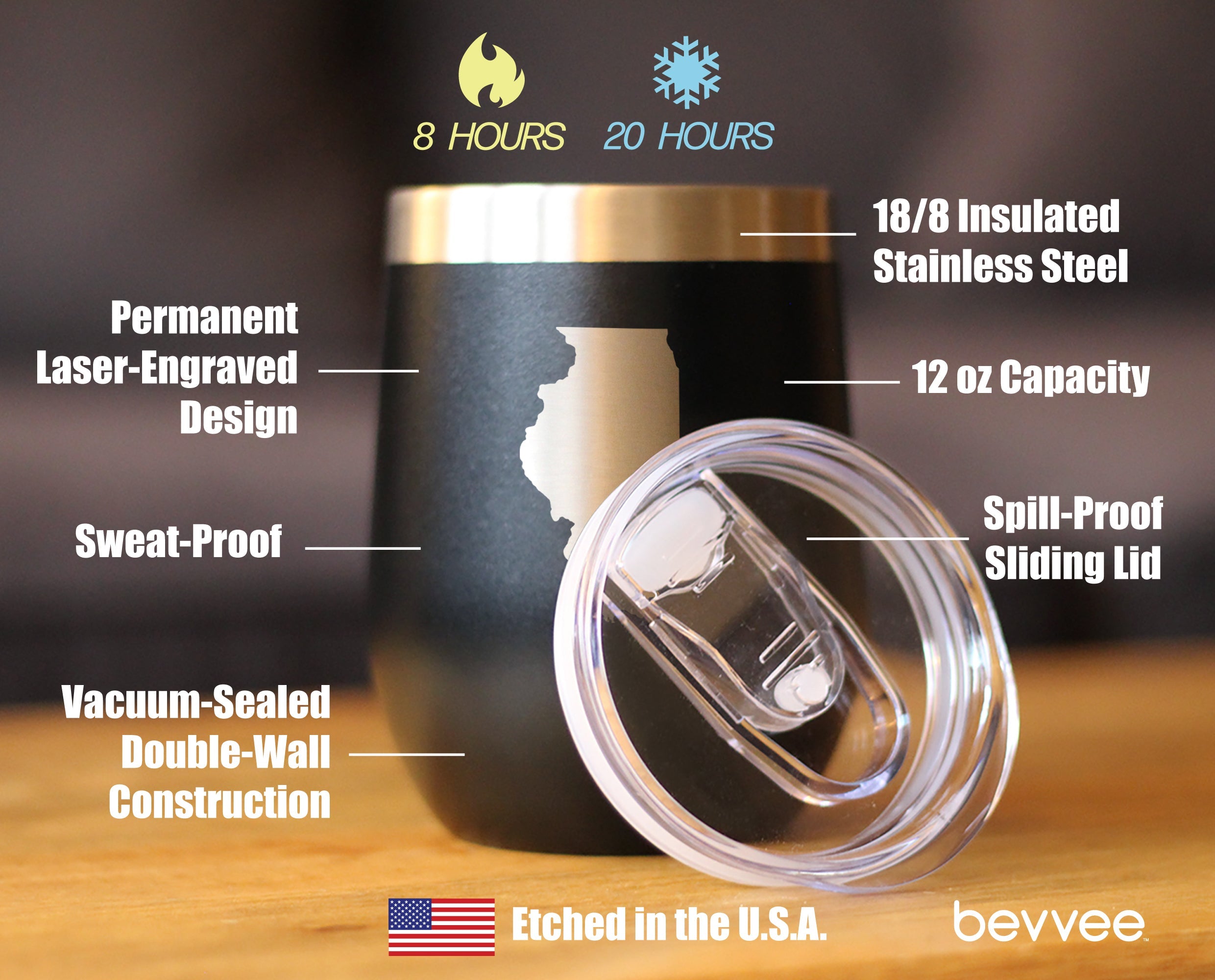 Our 12oz. stemless wine tumblers with sliding lids feature stainless steel double-wall construction, vacuum insulated for 2X cold and heat retention compared to glass or plastic containers! Etched in America.