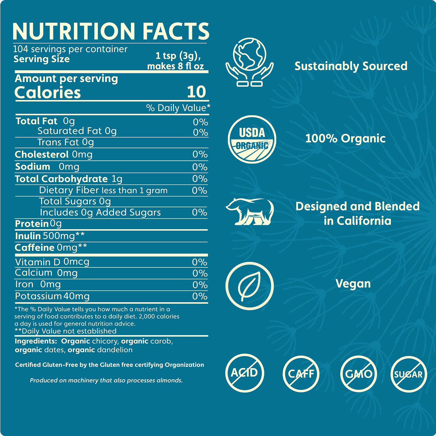 Enjoy intense coffee notes from roasted dandelion and chicory roots plus chocolaty carob---in instant form; lightly sweetened with organic dates
