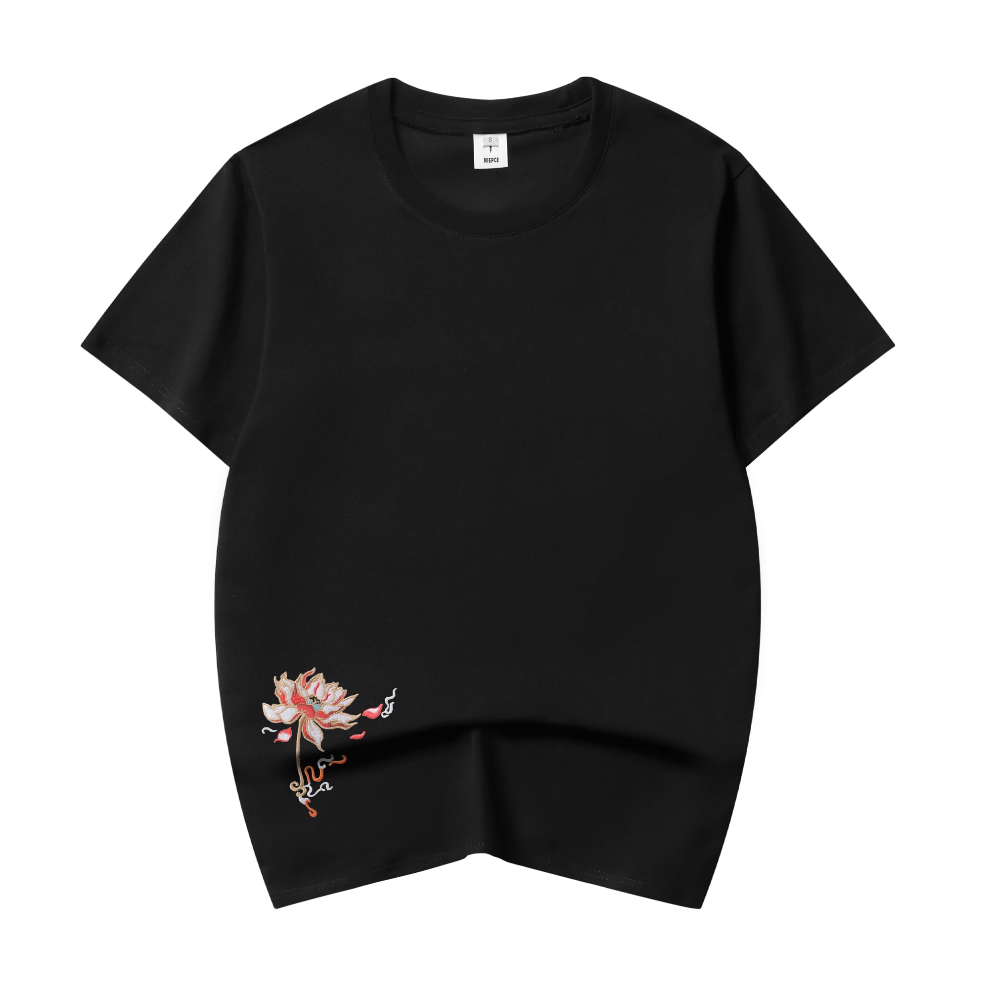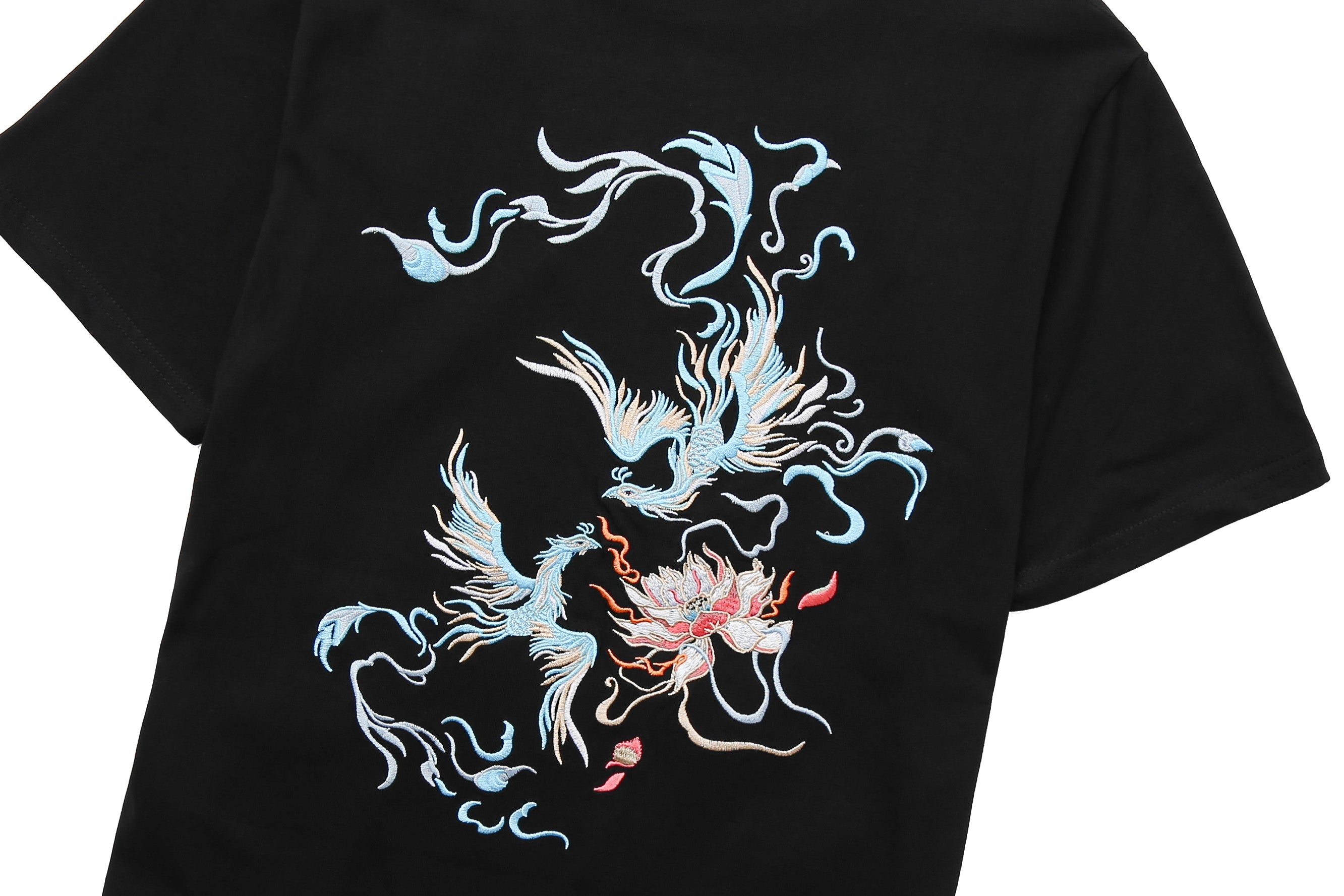 - Duo blue phoenix dancing design with a flower embroidered on the front of the tee