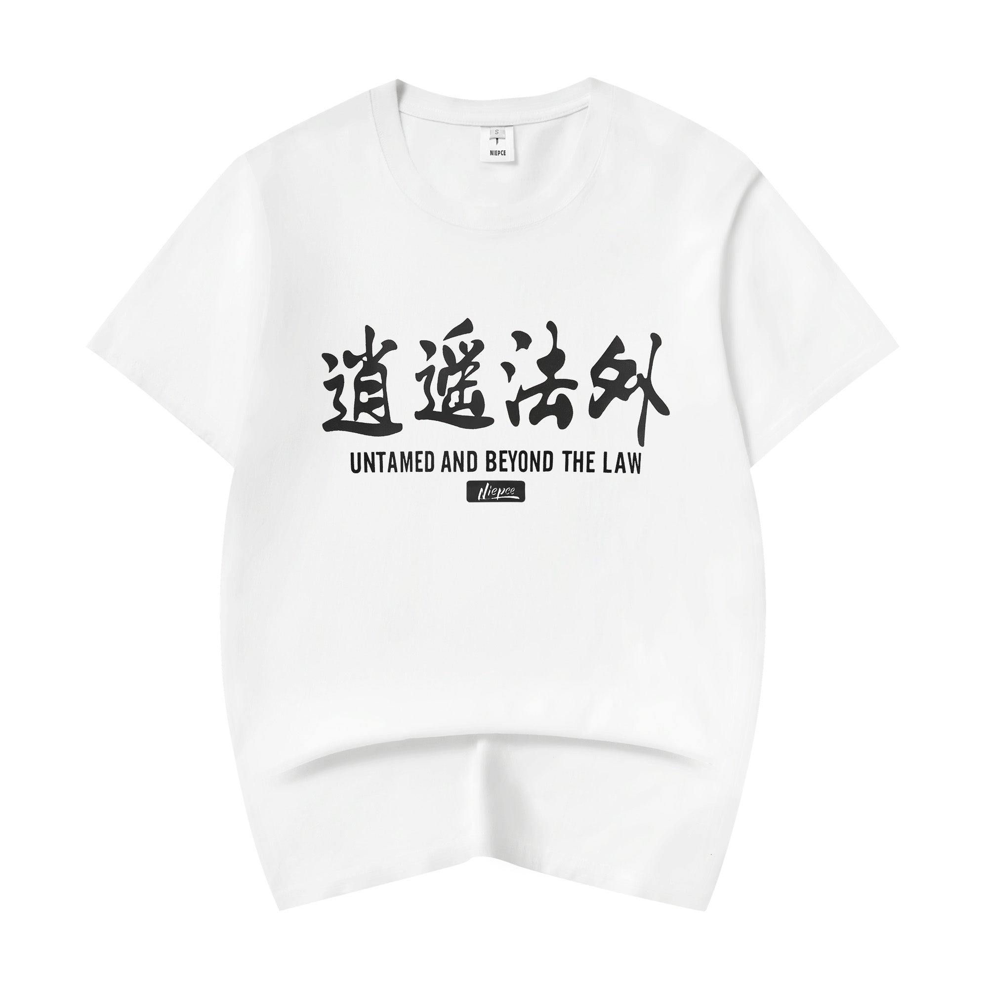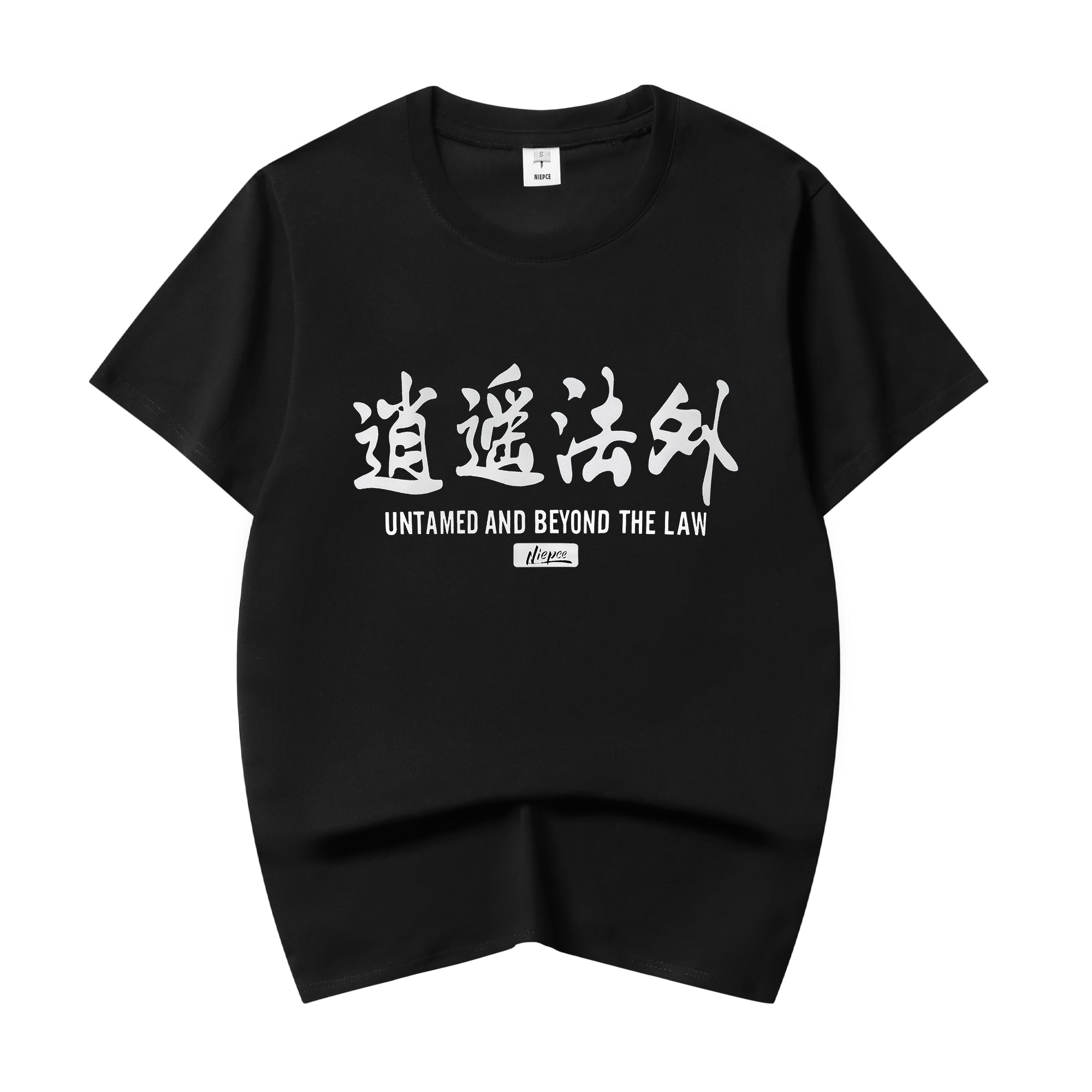- The short sleeve t-shirt features a Japanese painting of a demon biting a knife in the mouth. "Untamed and Beyond the Law" written in Japanese kanji on the front and back of the shirt.
