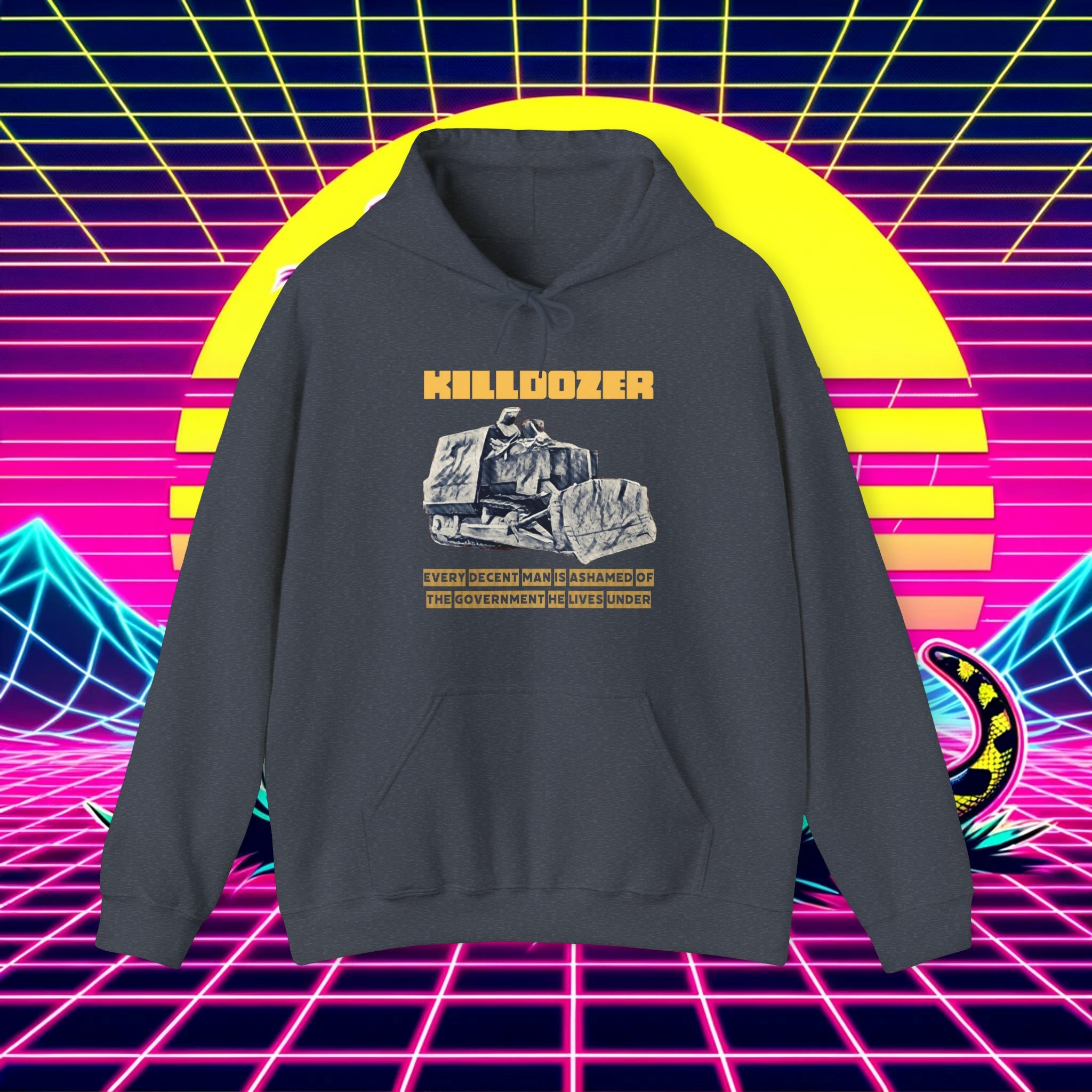 Introducing the ultimate hoodie for libertarians who are tired of big government and ready to show it off. Our hoodie features the infamous "Killdozer" built by the heroic Marvin Heemeyer. Emblazoned is the H.L. Mencken quote, "Every decent man is ashamed of the government he lives under," a powerful reminder of the need to resist oppressive government overreach.