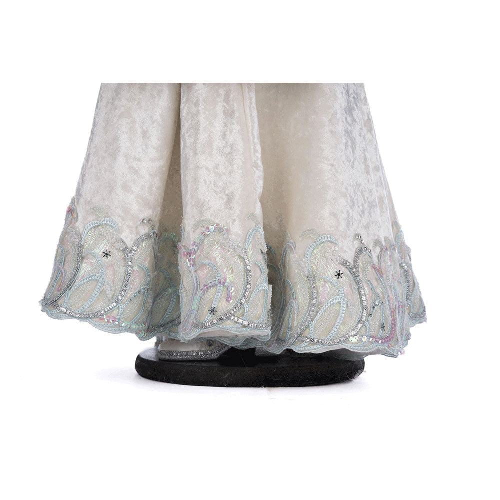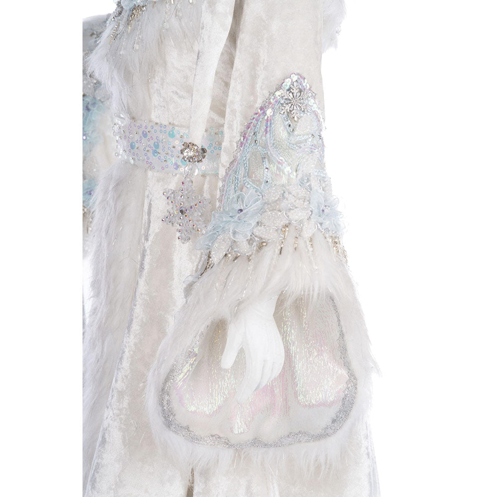 Meet King Winterfield Of Crystal Kingdom, a playful handcrafted doll from Katherine's Collection. This charming figure features soft, luxurious white fur-trimmed fabrics adorned with sparkling hand-beaded appliques, crystals, and sequins. His handmade rhinestone crown and airbrushed silver scepter add royal flair. Perfectly posed to stand or sit, he’s ready to bring a touch of winter magic to any display.