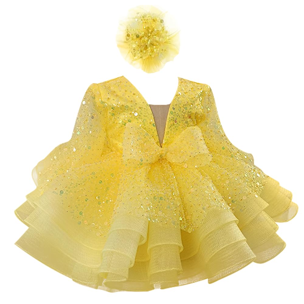 KLFFLGID Baby Girl Pageant Dress Sequins Embroidered Lace Toddler Flower Wedding Birthday Party Gown Dresses ‐ Yellow / 12-18 Months