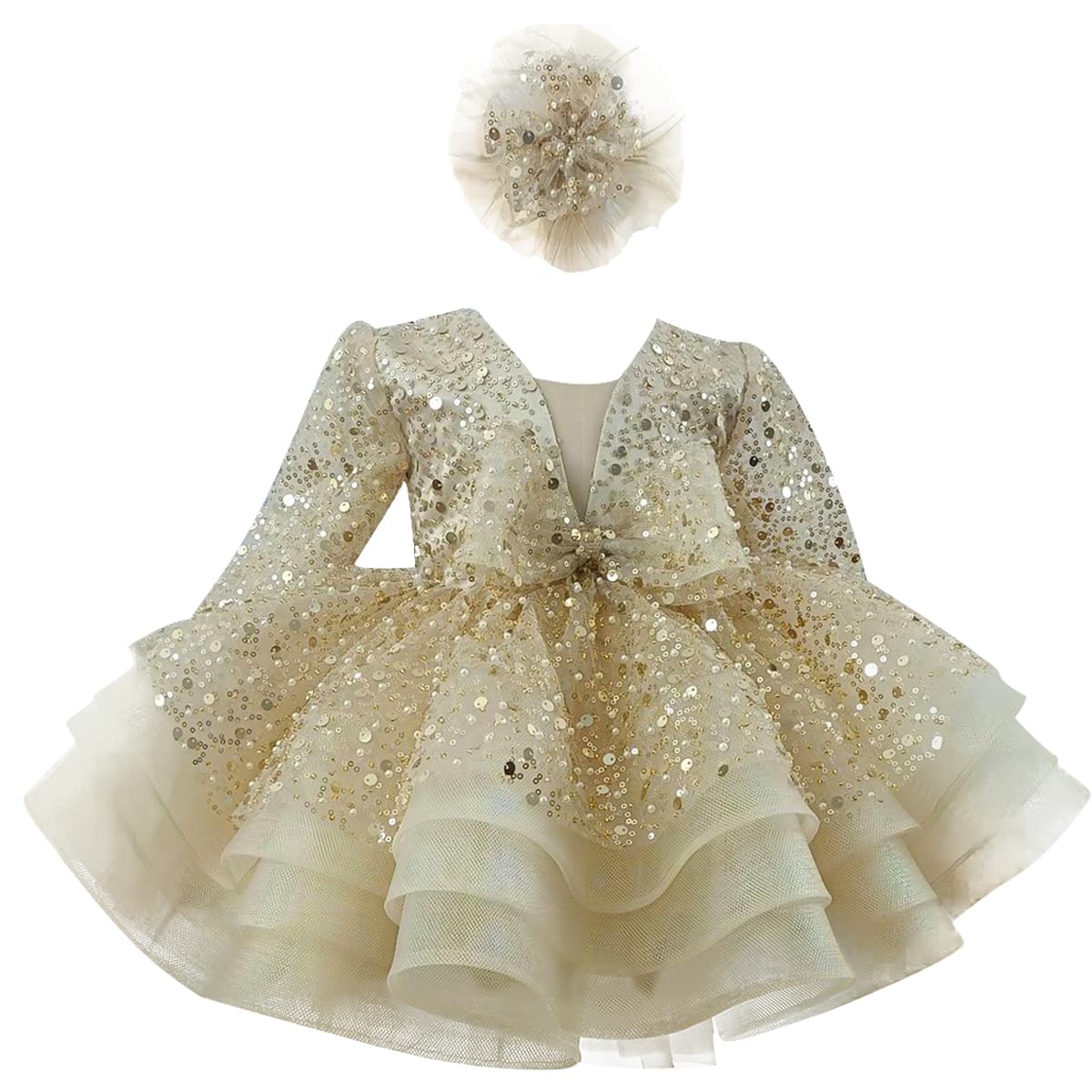 KLFFLGID Baby Girl Pageant Dress Sequins Embroidered Lace Toddler Flower Wedding Birthday Party Gown Dresses ‐ Champagne / 12-18 Months
