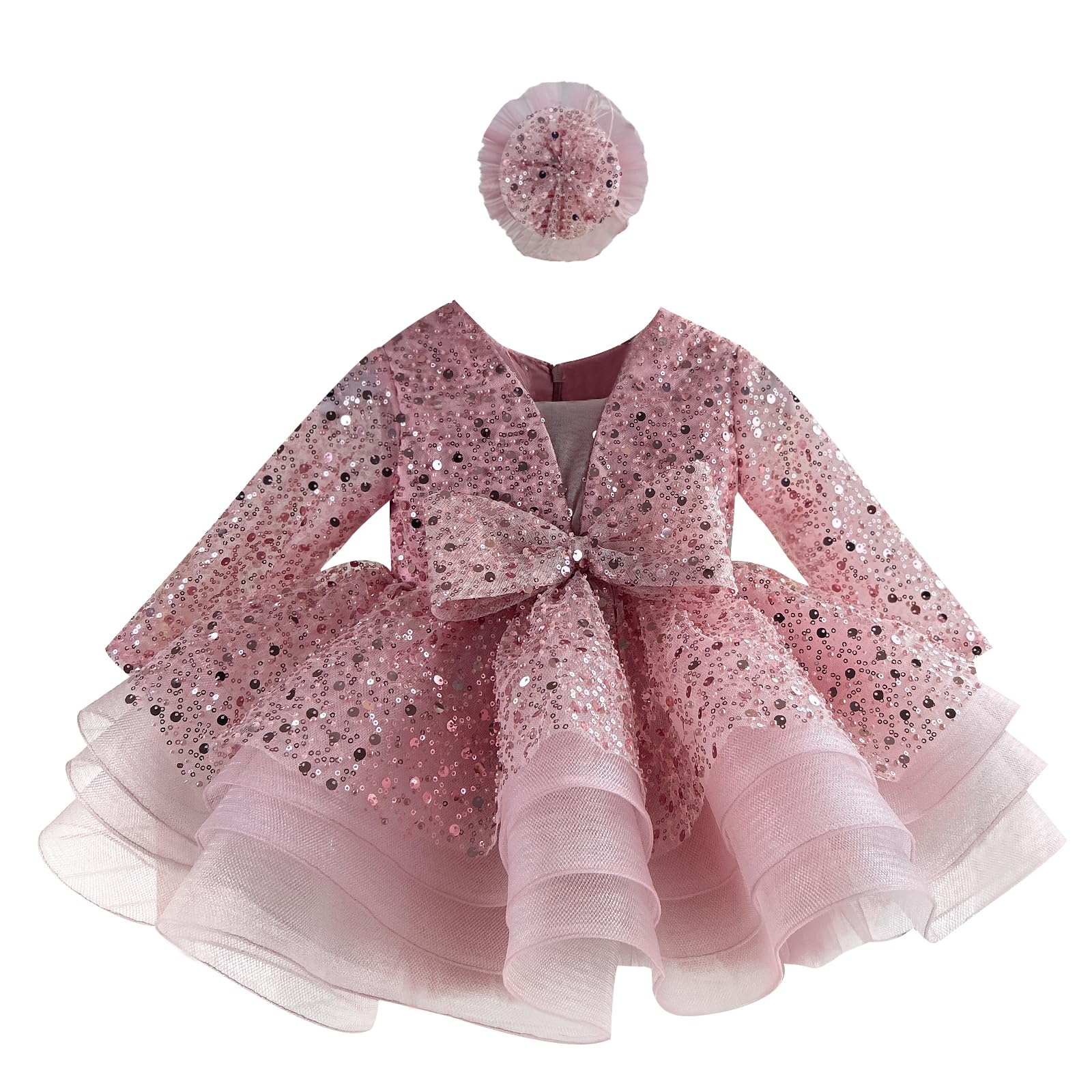 KLFFLGID Baby Girl Pageant Dress Sequins Embroidered Lace Toddler Flower Wedding Birthday Party Gown Dresses ‐ Bean Paste Powder / 12-18 Months
