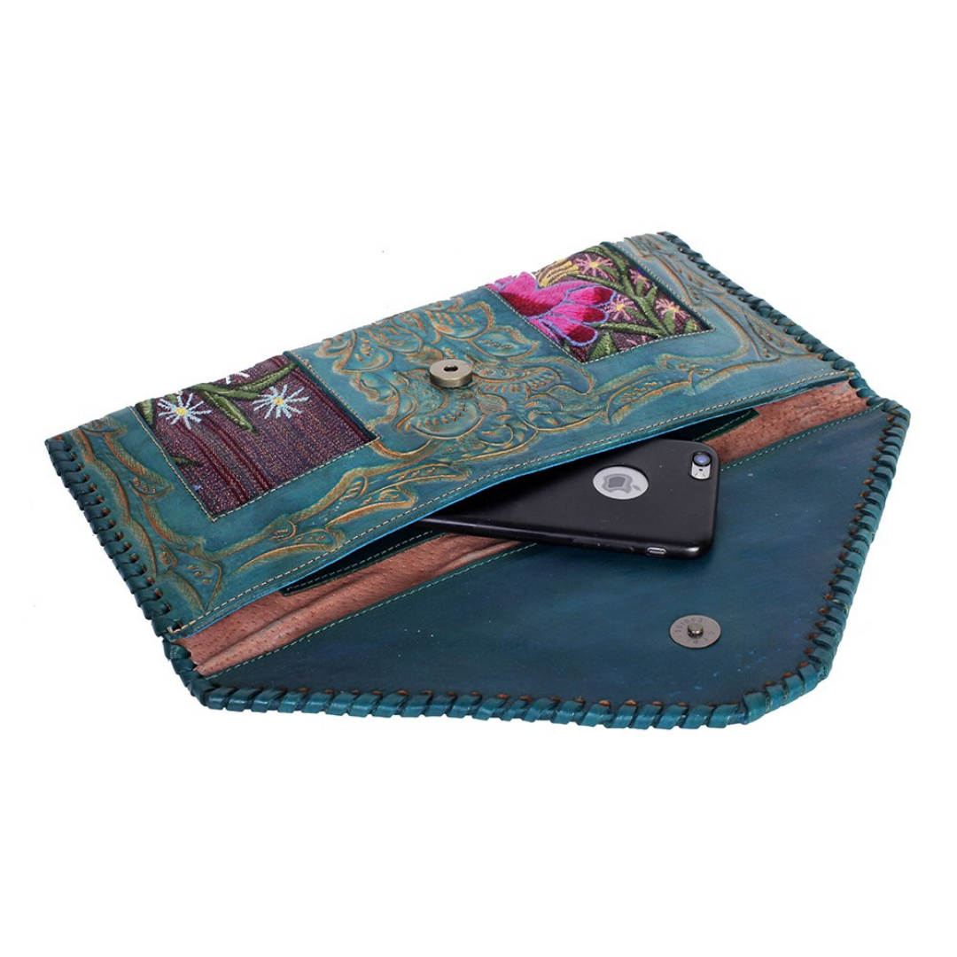Experience the fusion of traditional Mexican artistry and contemporary elegance with our Handcrafted Mexican Embroidered Leather Clutch. Skillfully made in Zinacantan, Southern Mexico, this clutch showcases vibrant, traditional embroidery, a hallmark of the region's rich textile heritage. Paired with high-quality, intricately tooled leather, it's more than an accessory—it's a work of art. Adhering to Fair Trade guidelines, each clutch is lovingly handcrafted by our women artisan partners, ensuring ethical production and sustainable materials.