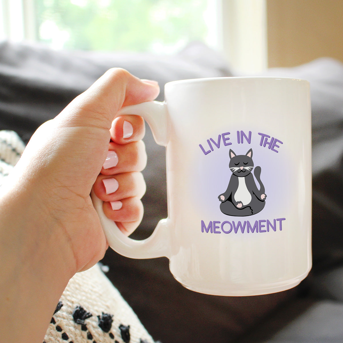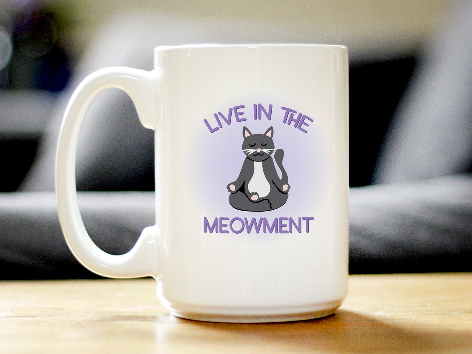 Live In The Meowment Coffee Mug - Funny Cat Gifts and Meditation Themed Decor ‐ 15 oz