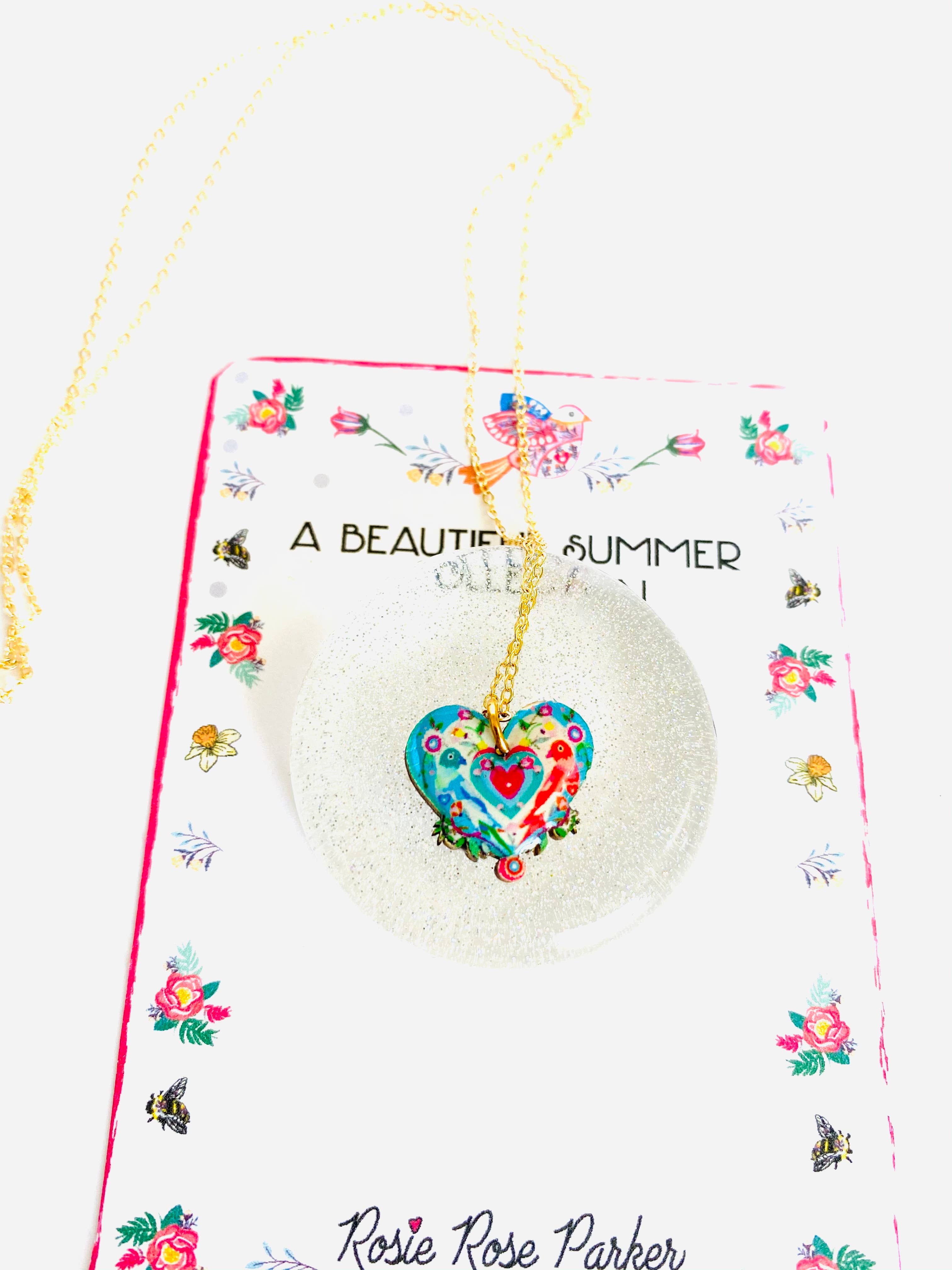 Let this Lovebird Necklace by Rosie Rose Parker add a touch of whimsy to your everyday look. The pretty love bird pendant, laser cut with hard resin for a glass-like effect, and adorned with sparkling gems, brings the original illustration to life. The dainty gold plated chain, with an 18 inch drop, perfectly rests on your chest. A playful and unique addition to any outfit.